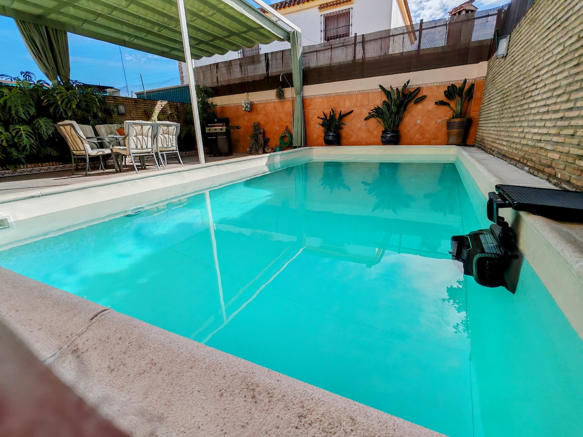 "A un paso de Sevilla", concretamente a 500 metros de la parada del Metro de San Juan Alto, que te dejara en apenas 10 minutos en Puerta de Jerez! La casa es muy espaciosa y aloja hasta 8 personas. Refréscate en su piscina de agua salada (no climatizada) y uso exclusivo, déjate himnotizar por su chimenea de leña, o relájate en la terraza de la buhardilla, mientras cenas y escuchas musica en su equipo HIFI. ¡Vistas a Sevilla!
