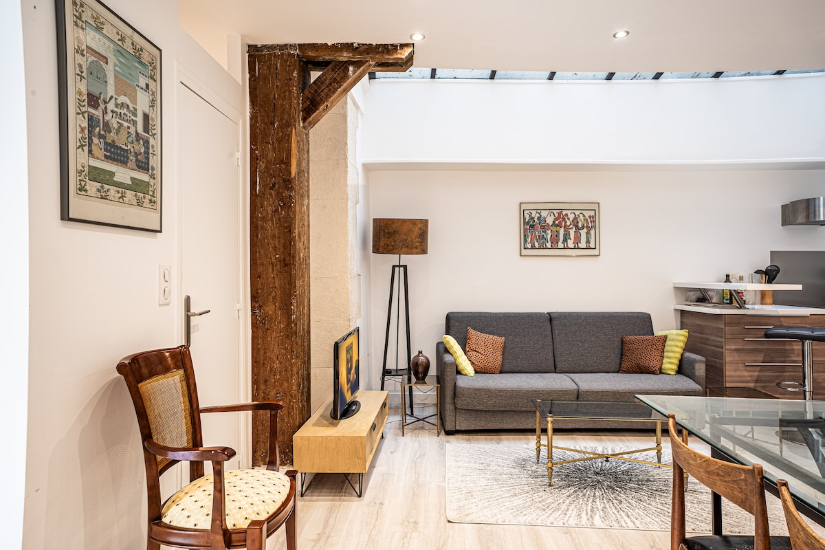 Amazing apartment totally renovated facing one of the most ancient Gothic cathedrals in the world, preciously decorated. Very sunny 4th floor walk-up located between the Louvre and Pont Neuf, with a bedroom (queen size bed) , a large living room with a very confortable sofa bed (140x190), full kitchen, bathroom with bathtub, fireplace, flat TV and fast wifi!