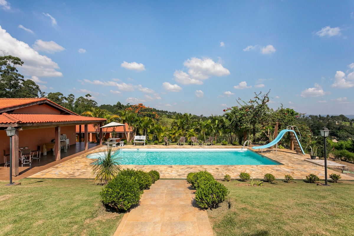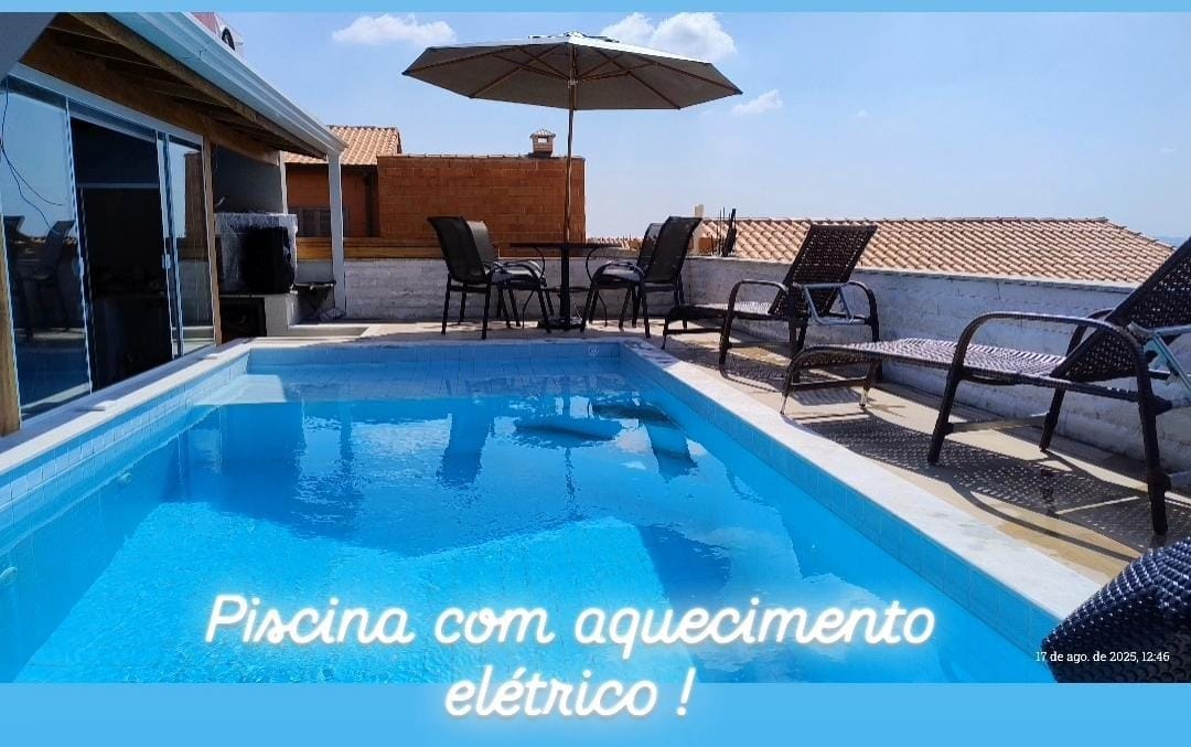 Linda chácara, em meio a natureza, com muito espaço e conforto para toda familia. Espaço moderno e muito bem equipado com churrasqueira, forno de pizza, choppeira, adega, som ambiente e todos os eletrodomésticos e utensílios de cozinha. Diversão garantida com piscina aquecida, escorregador inflável, parquinho, quadra de esportes, fogueira, salão de jogos. Conforto para todos com ar condicionado e televisão nas áreas comuns e nos quartos.