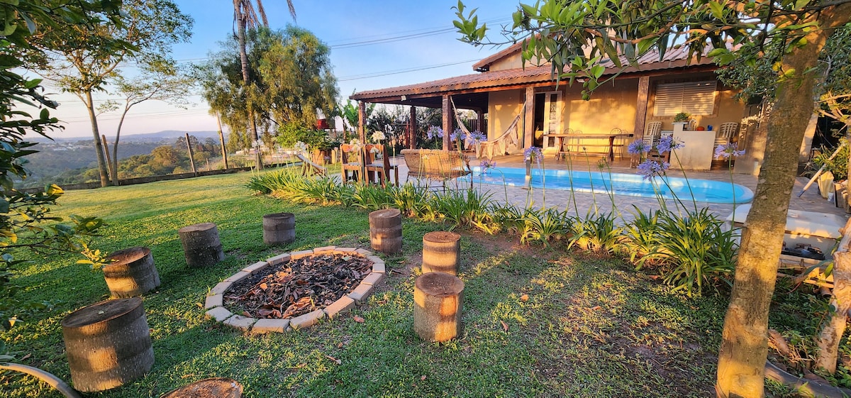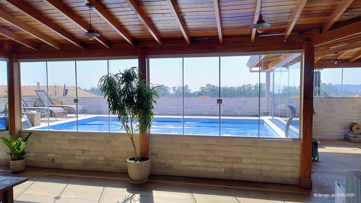 Relaxe com toda a família seu lazer te espera aqui!Venha viver um sonho,50 min de SÃO PAULO,saia um pouco da correria do dia a dia,casa toda rustica que te traz paz e sossego/condomínio fechado,casa com piscina, churasqueira,fogão a lenha,forno! HIDRO aquecida,vista para o por do sol, suporta até 07 pessoas,WI-FI,Tv 75,netflix,prime,paramount,Premiere, mercado, Adega,pizzaria,padaria a 10 min (Parque aquatico 60$ entrada) Area de salão com piscina grande e infantil,churrasqueira e ping pong