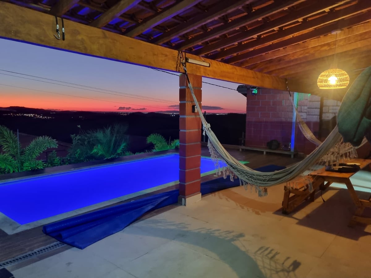 AGORA COM PISCINA AQUECIDA. SEMANA DE 13 A 20/12 livre Imóvel novo recém inserido no catalogo do AirBnb Condomínio Porta do Sol COM ACESSIBILIDADE Relaxe com sua família nessa acomodação com piscina coberta, area de lazer, rua sem saida. São 4 suites, sendo duas com ar cond e duas com ventilador teto Uma suite com ACESSIBILIDADE. Roupa de cama completa. Salão com churrasq. forno pizza, bar,cozinha,adega,mesa jogos,telão. Redário, FirePlace, paz, sossego e segurança.