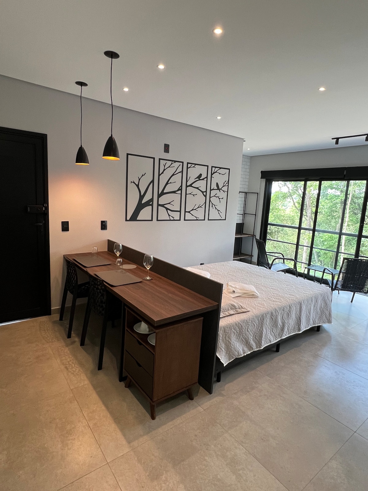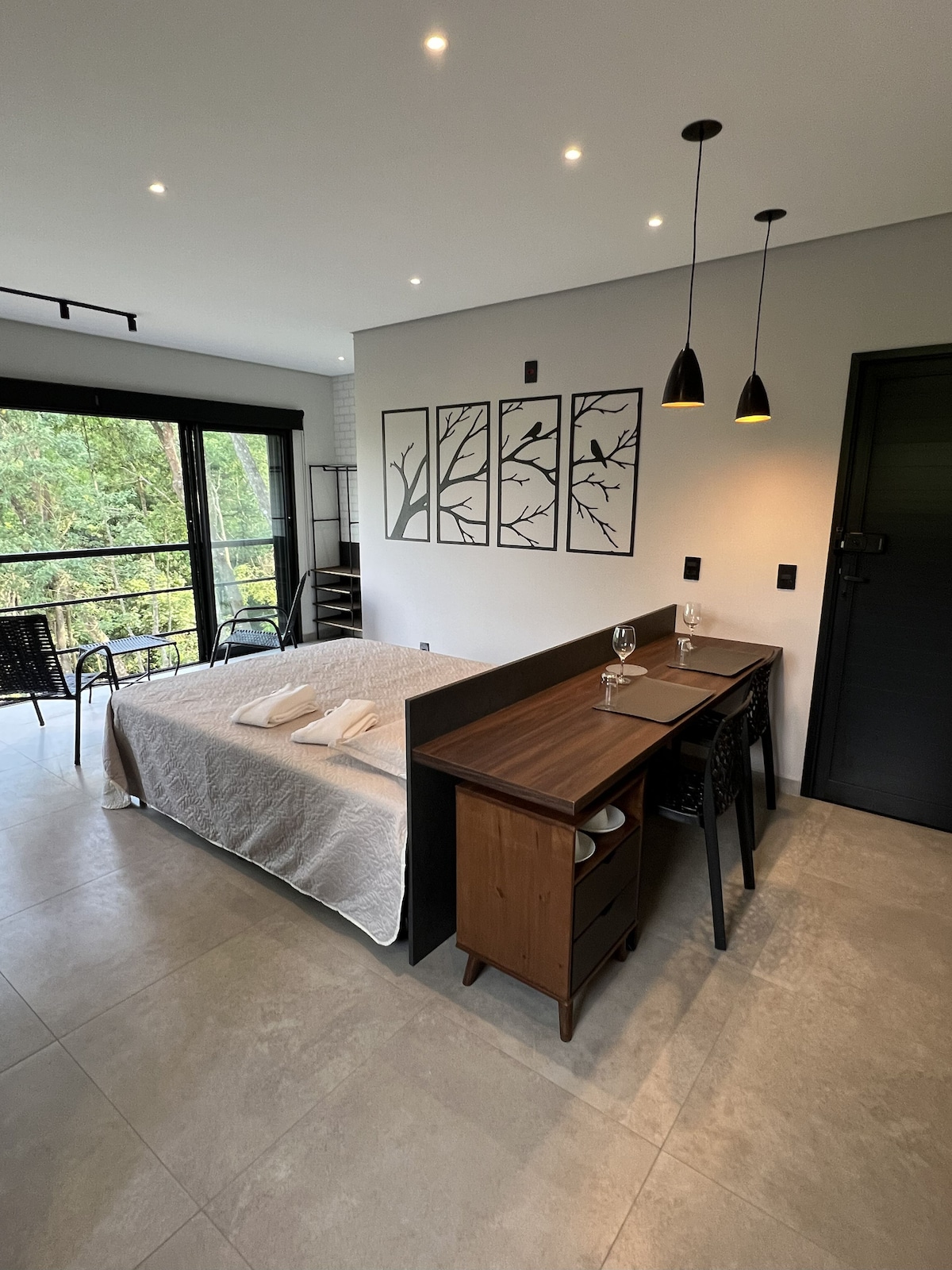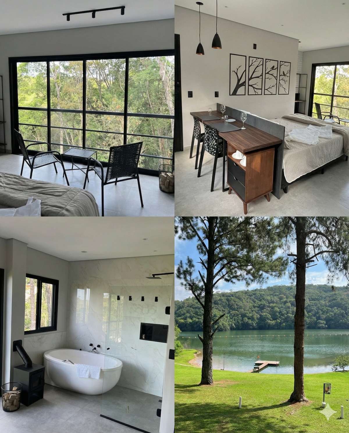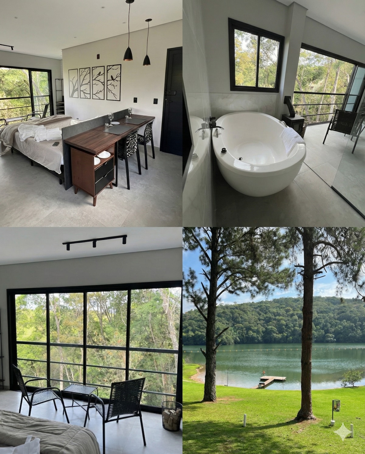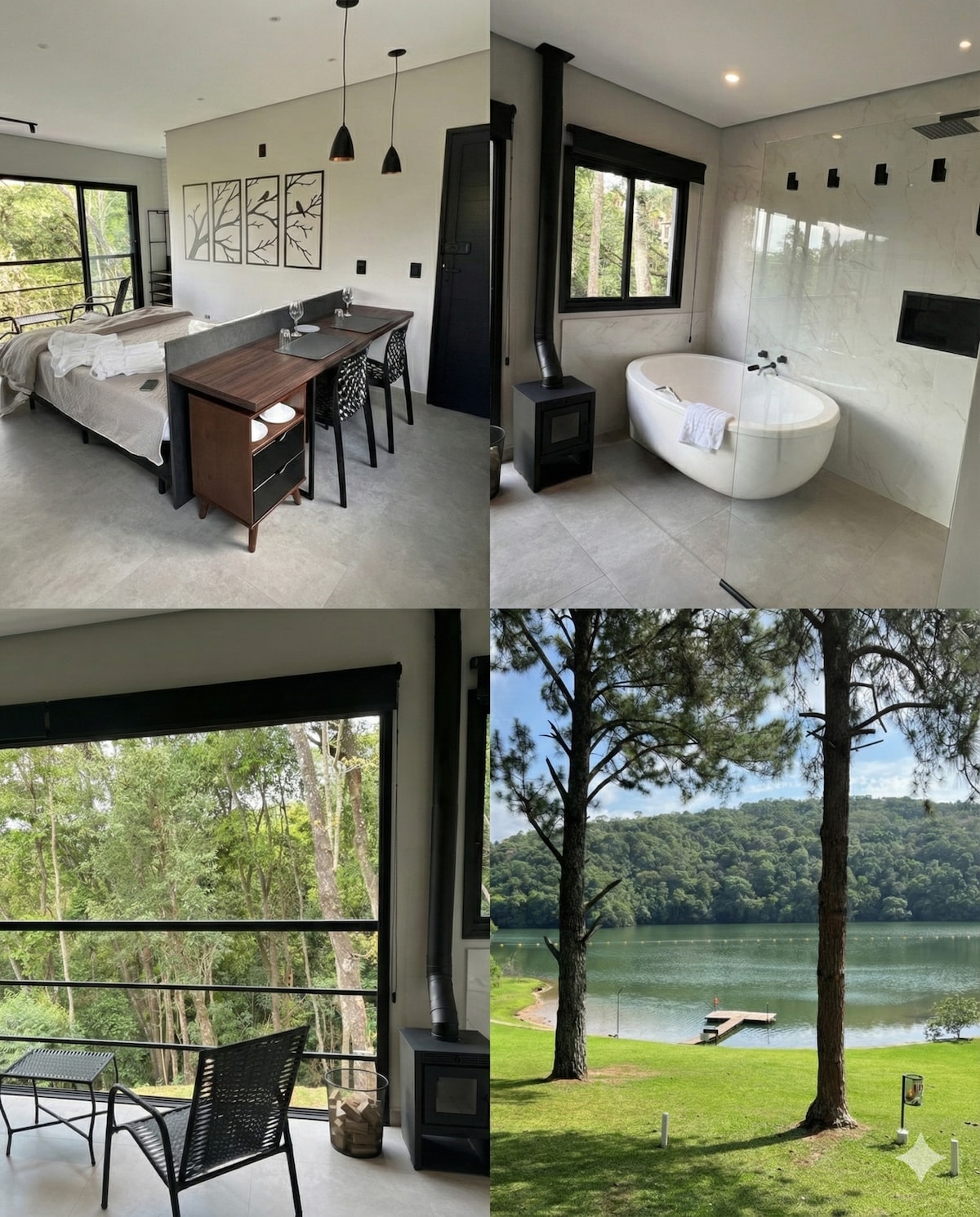 Enjoy a romantic and relaxing experience in a space with panoramic windows overlooking the forest. Relax in a soaking tub with a view and warm your nights by the charming fireplace. The suite combines comfort and design, with a queen-size bed, a dining area, and a relaxation corner. Located in a gated and secure subdivision (24/7), you'll have access to the serenity of the dam and the mountains. You'll be in complete contact with nature: wake up to the sound of birds and renew your energy.