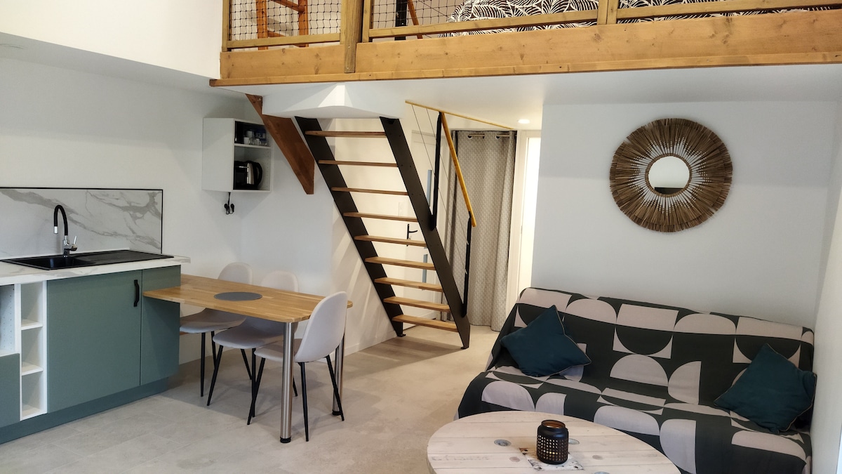 Joli Studio de 30m2 entièrement neuf (2023) Situé dans le quartier sud de Vertou, en face des vignes et à 5mn du centre commercial Pôle Sud. Accès direct à des balades à pied depuis la maison. A 20mn en voiture du centre de Nantes. L’appartement est attenant à notre maison, avec une place de parking privative. Idéal pour travailler la semaine ou vos escapades du week-end ! Quartier calme, accessible uniquement en voiture.