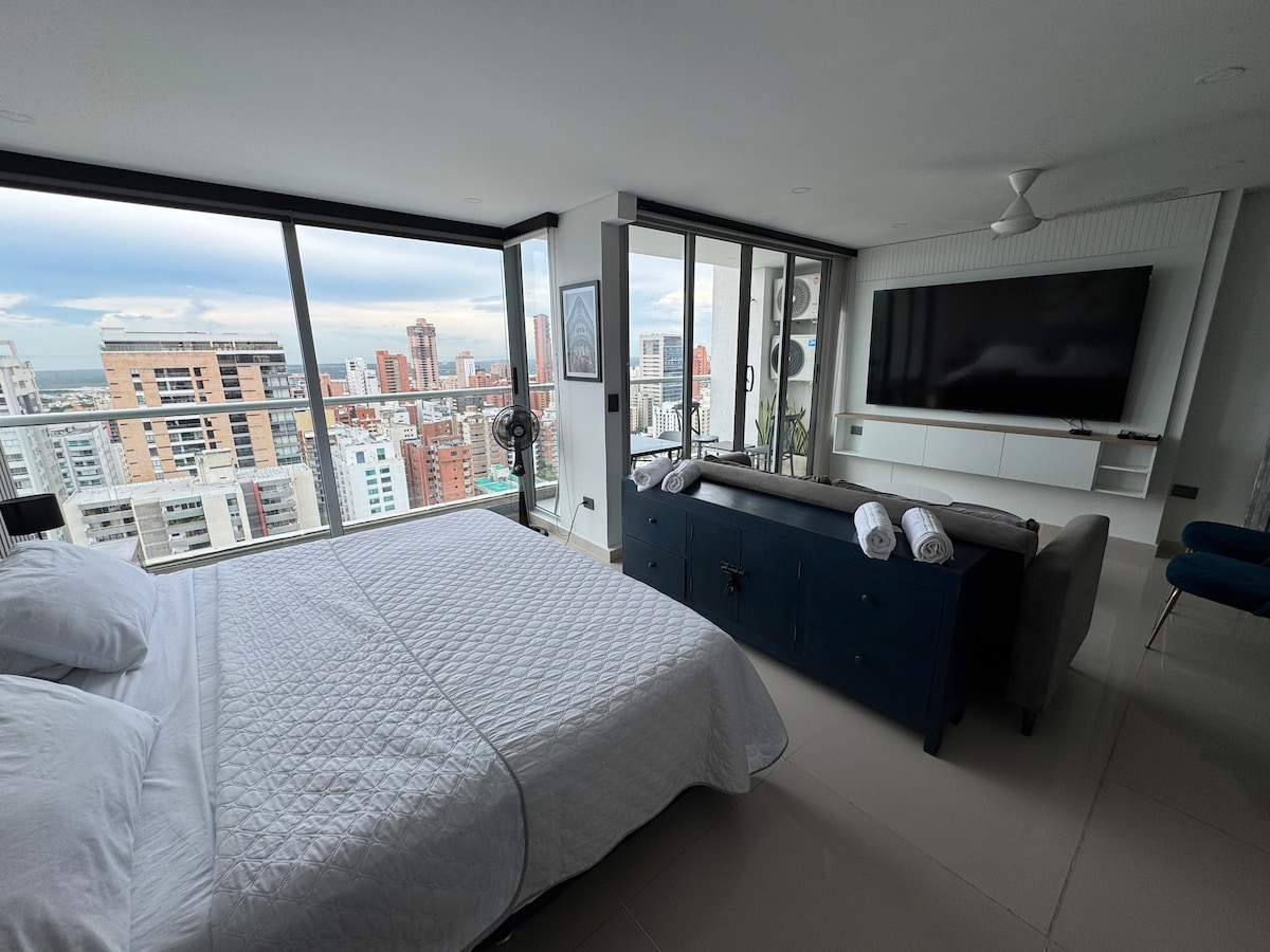 Estupendo estudio con todo lo necesario para sus vacaciones o viaje de negocios. Ubicado en el sector de el Poblado en Barranquilla, con fácil desplazamiento a cualquier punto de la ciudad. Situado en el eje corporativo, hotelero y comercial, a solo 5 minutos de centros comerciales, restaurantes, entidades bancarias, flotas de transporte y notarías.