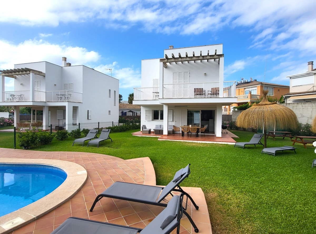 Relaxed holidays in Mallorca. 100 meters from the sea on the wonderful Muro beaches. Complex with 2 houses of 200 m2 with pool and air conditioning in a quiet area. Ideal for families and large groups. Each house has 3 bedrooms (one suite), 2 bathrooms, 1 toilet, living room, kitchen and laundry. Fully equipped. Available for 12 adults in total (6 guests per house)The 2 houses are rented together, not shared with other groups.Tourist tax not included ETV/9654 ETV/9680