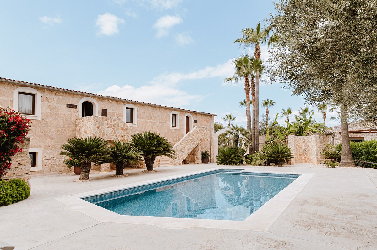 Es Bellveret is a cozy finca with amazing peaceful views and a 15 meter long infinity pool of salt water ideal to relax and enjoy the Majorcan sun only surrounded by nature and the sound of birds. It is close to the towns of Manacor, Sant Llorenç and Artà as well as to many beaches. The style is a blend of modern and rustic decorated with traditional Mallorcan details. If you want to relax within the mountains and coasts of Mallorca do not hesitate to visit us.