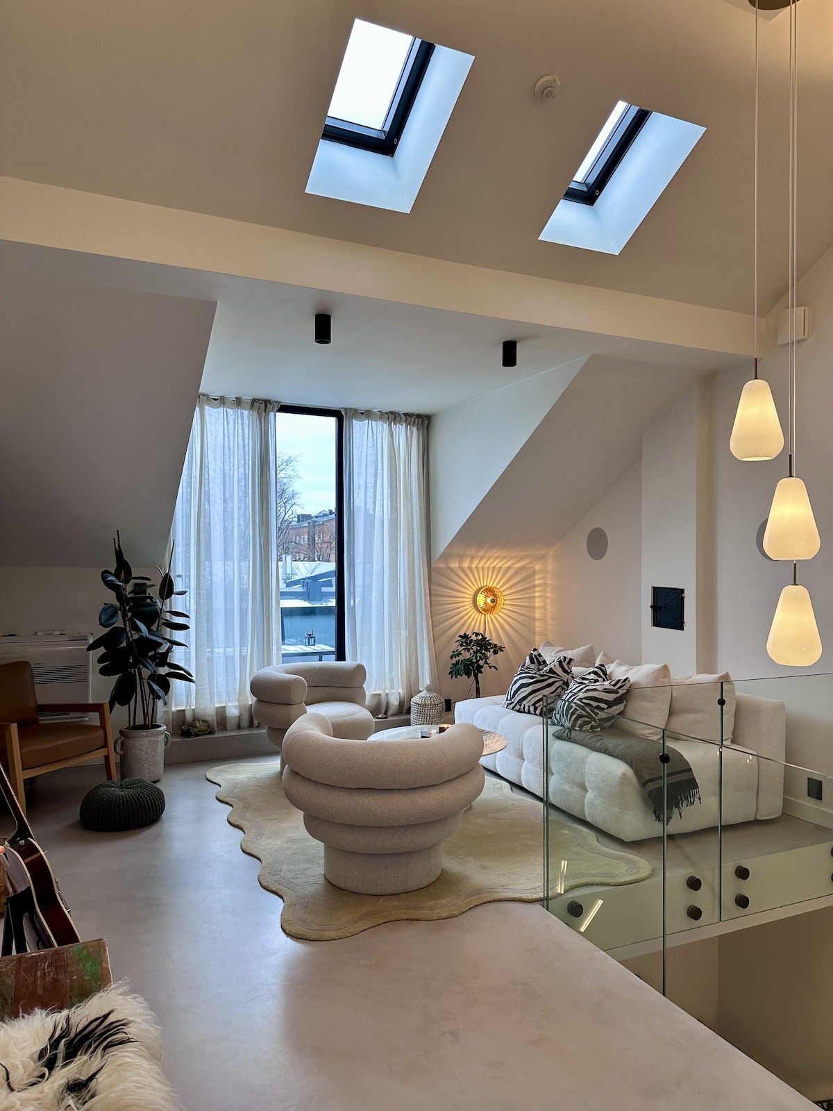 New high-end duplex apartment, designer-built with a luxury New York loft inspiration. Features 12 built-in-walls speakers for cinema sound, air condition, fireplace and a swing. Living room with a full-length open door to balcony. The bedroom has a purifier/humidifier for best sleep. Access to a garden and free indoor parking in private garage facility. Just a 4-min walk to Frogner Park. Cafes, restaurants, gyms, groceries, bus stops are right outside. Two bikes are available for your use.