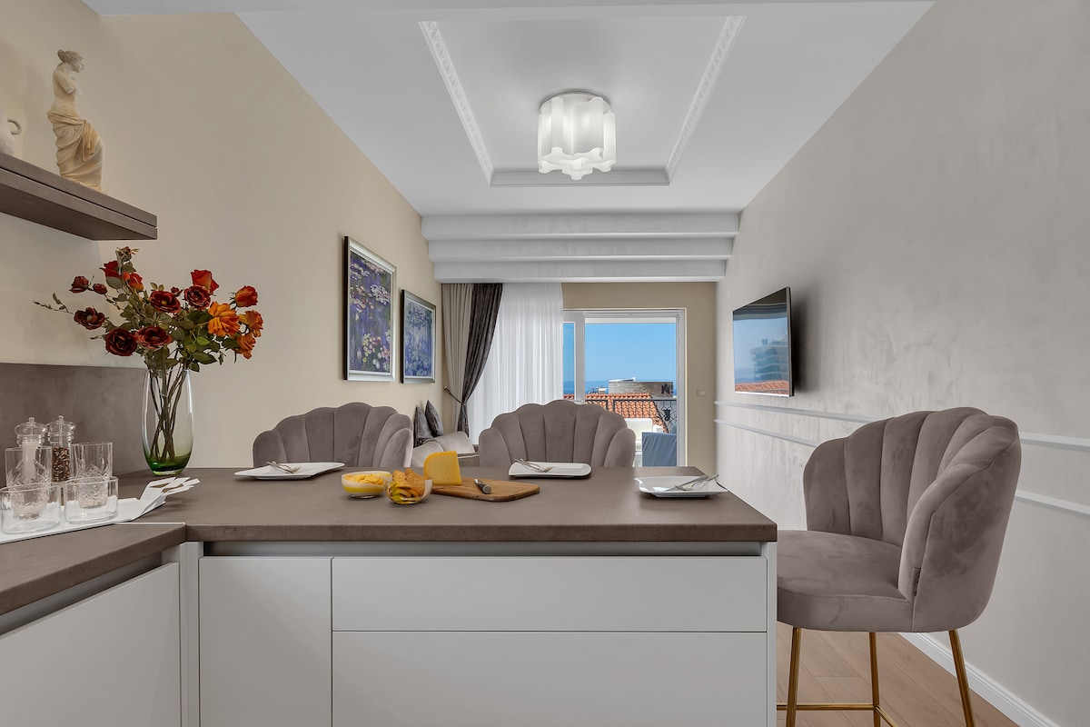 New modern apartment with sea view just 350 meters from the sea. Elevator. private parking Apartment is fully equipt. It has bedroom with King size bed 180x200. Bathroom has big walk in Shower. Nice living room with fully equipt kitchen and big balcony with stunning seaview and islands. You can enjoy on Balcony with glass od wine and watch sunset or rest on big sofa on living room and look sunset. Living room has table for 4 persons.