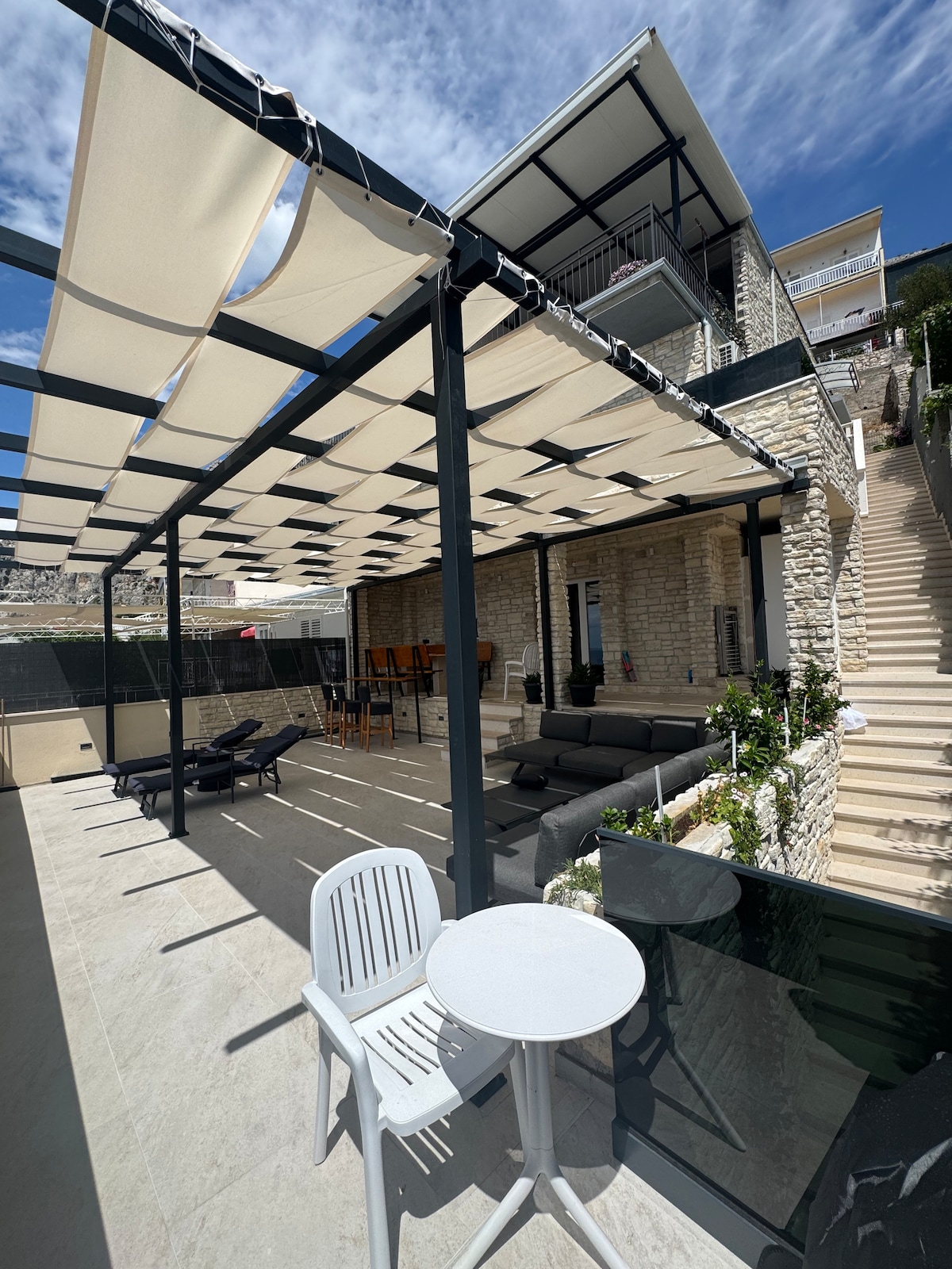Welcome to our brand new Villa San Tonini Deluxe Apartment, located in Mravince, City of Solin, in Split-Dalmatian County. Great accommodation for families and group of friends, situated only 8 km from the center of city of Split. Our unique and luxury property is defined by its exceptional location and outdoor areas, providing panoramic vistas of the Adriatic Sea and theMediterranean landscape. Outdoor lounge, terraceand swimming pool are the unique points of this luxury apartment.