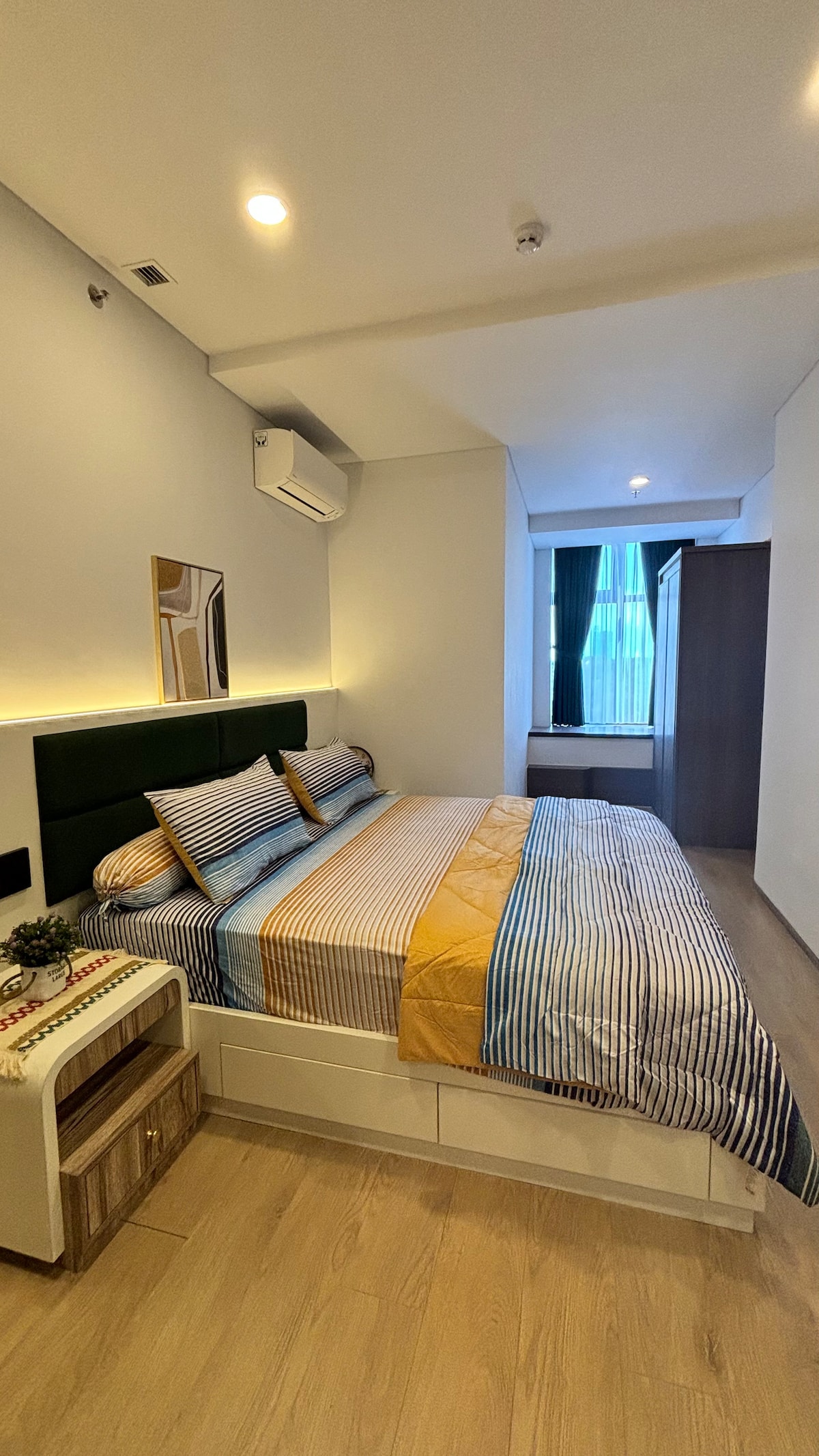 Tipe Suites 2 Bedroom Luas : 80 m² -Kulkas -mesin kopi -Dispenser -Mesin cuci -Peralatan dapur -Peralatan kebersihan -Wifi -Water heater -Balkon -TV -Setrika baju -Jemuran lipat -Sprei/bedcover -Listrik 3850 Watt Fasilitas 1. Kolam renang 2. Gym 3. Security 24Jam 4. Card access 5. Listrik & Air 7. Multi function room 8. Rooftop lantai 31 altitude *Tarif Promo September-oktober* Harian Rp1.5jt/malam Bulanan Rp25.jt/bulan 1 Tahun Rp200jt *Biaya maintenance ditanggung Pemilik Unit*