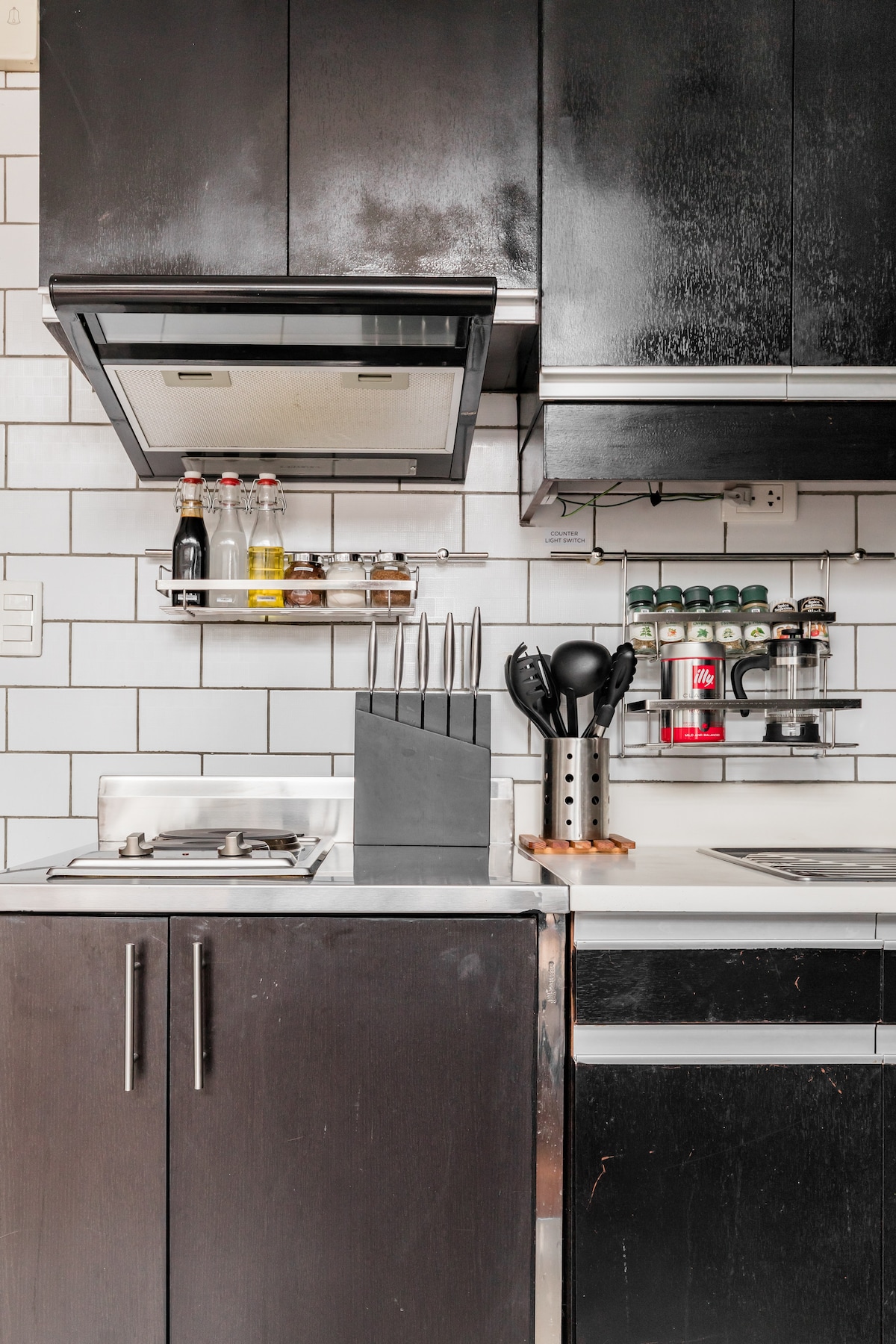 Open the complimentary wine and listen to music via retro Marshall speakers. Here custom wood furniture meets textured concrete walls, plush Persian carpets, classic vintage pieces and 60s pop art accents. A refined fusion of industrial and retro features ultimately lends this loft its unique, special character. Perfect for a photogenic boutique art hotel vibe. A fantastic option for business travel and couples with discerning taste, looking to stay in one of Manila’s most premium locations.