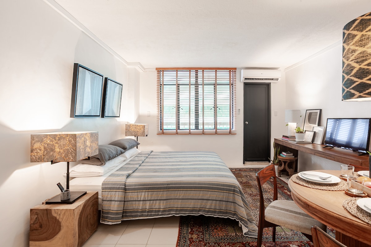 Perfectly situated in the heart of the Poblacion, Makati Restaurant and Entertainment District, our unit is located on the 2nd floor of a boutique condo building w/ 24 hour security. Our 1br boasts a modern Indonesian, Balinese interior and amenities including a 55" TV, Netflx, 550 Mbps, with full kitchen. Walk to nearby bars, casual restaurants, and fine dining. Experience art and culture! The perfect destination for couples, solo adventurers, a business traveler, short trips, and vacation!