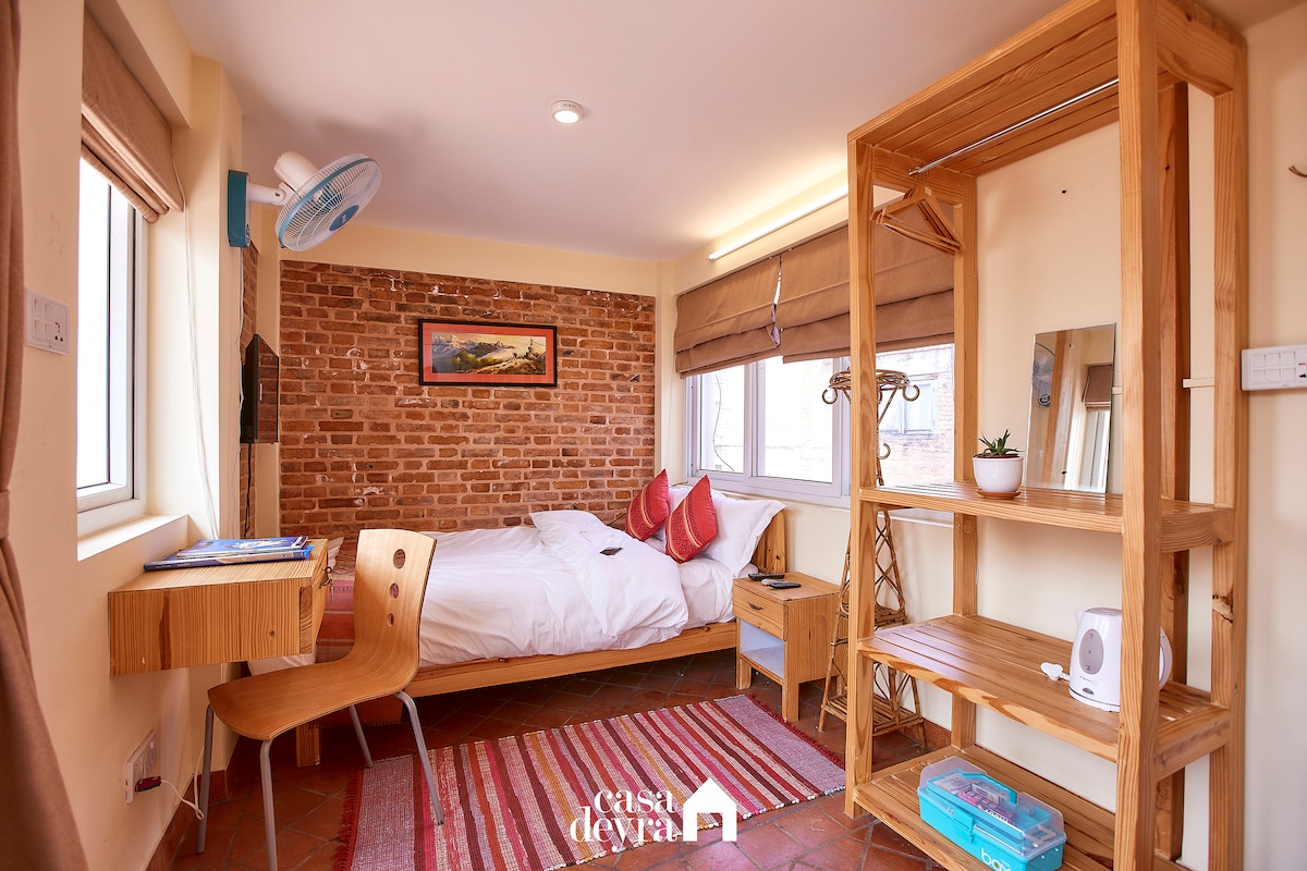 Charming, fully furnished spacious studio in the heart of Patan, 250m from Durbar Square and 100m from the Golden Temple. Queen-sized bed, AC(hot and cold), and 24-hour hot water in an inviting and safe neighborhood. Double-glazed glass ensures a peaceful stay. Perfect for a sun-porched getaway. The rate also includes house keeping twice a week where your bed sheets and towels will be changed once a week.
