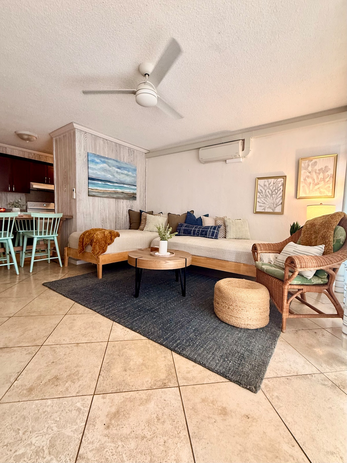Bask in the breathtaking ocean views from our Maui penthouse! Centrally located, our beautifully remodeled suite offers full beachfront, ocean and pool access. The master bedroom features an incredibly comfortable California king bed with an en suite bathroom and stone walk-in shower. There is also a king size cozy sleeper sofa in the living room which has direct access to the second full bathroom. The modern kitchen is fully equipped with everything you need!