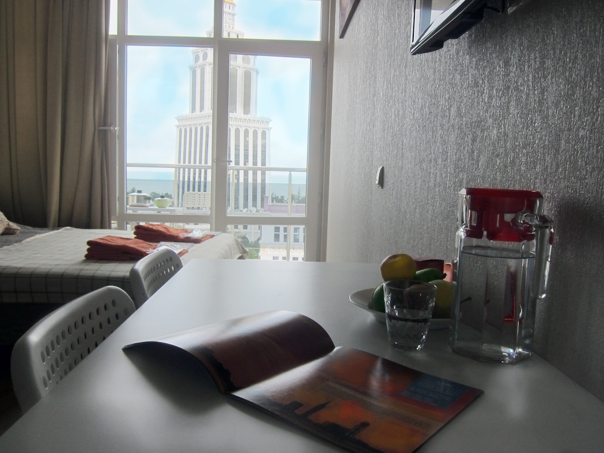 Boho-style studio in the historical center of Batumi — Porta Batumi Tower 🌅 Panoramic windows with a breathtaking view of the sea, mountains, and city - Bathtub! - Perfect cleanliness and freshness! - Excellent soundproofing! - Warm floors! - Many elevators that work without delays 📍 Nearby: 🏛 The Sea, Old Town, Europe Square, boulevard, restaurants and cafes are just 5 minutes away 🛒 Supermarkets, pharmacies, hookah bars and bars are nearby 🚘 Convenient parking near the house