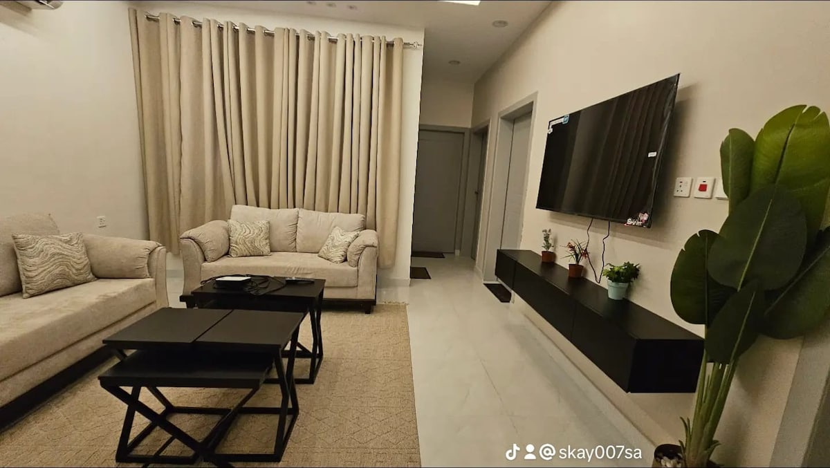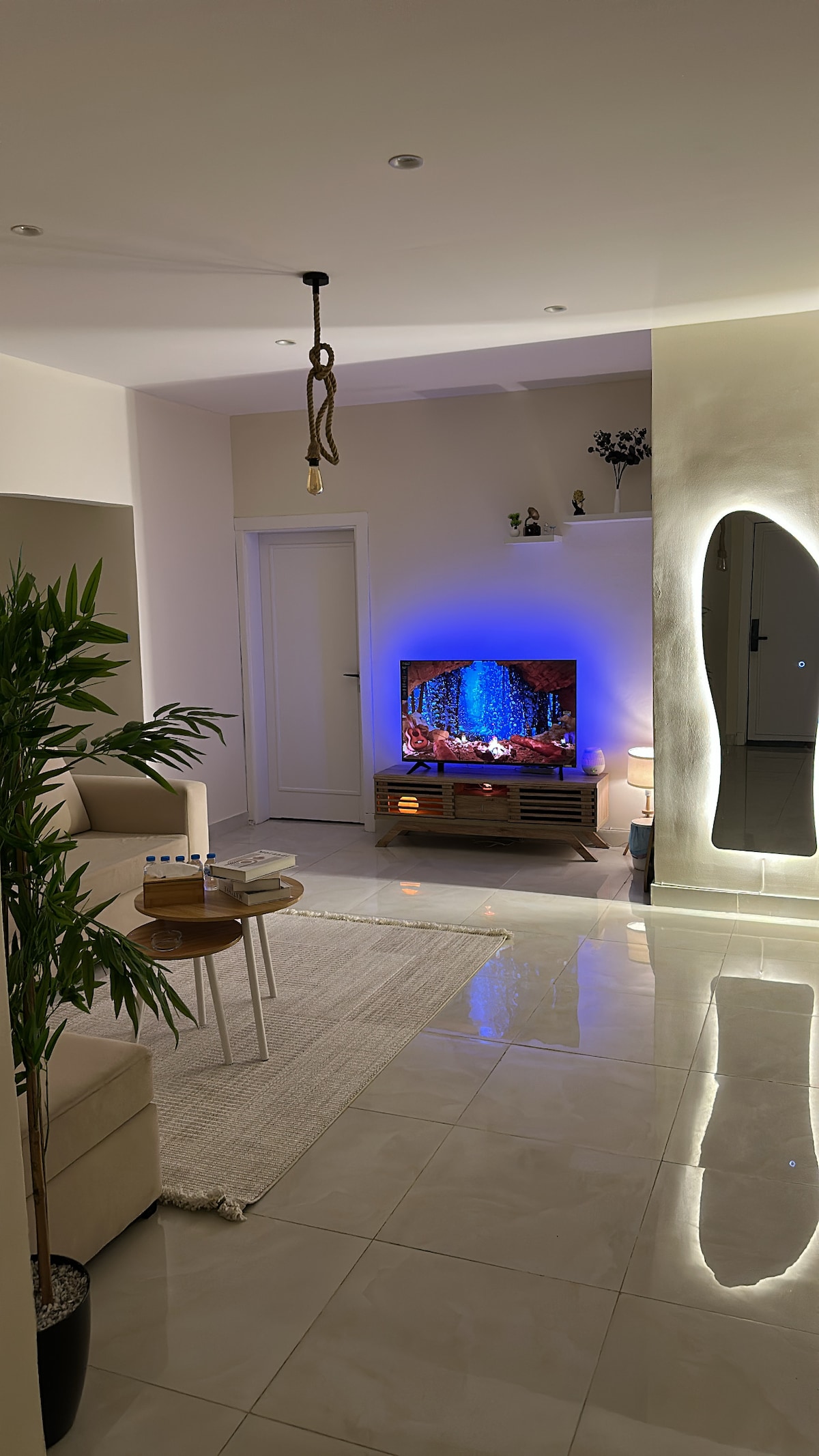 المساحة: تحتوي الشقة على غرفة نوم وصالة وحمامين ومطبخ غرفة نوم رئيسية: مجهزة بسرير مزدوج مع تسريحة ودولاب ملابس الصالة: مريحة وتضم تلفزيون ذكي مع رسيفر بي إن سبورت منطقة الطعام: طاولة طعام تتسع لستة أشخاص، مثالية للوجبات العائلية خدمات إضافية ركن القهوة: مجهز بأدوات V60 وماكينة أمريكانو، مع مجموعة أكواب للقهوة لتجربة مميزة مغسلة خدمة: تقع بجانب الصالة لتسهيل المهام اليومية المطبخ: مجهز بالكامل بجميع الأدوات الضرورية، بما في ذلك صحون، كاسات، ملاعق، ميكرويف، فرن كهربائي، ثلاجة، وموقد كهربائي للطبخ