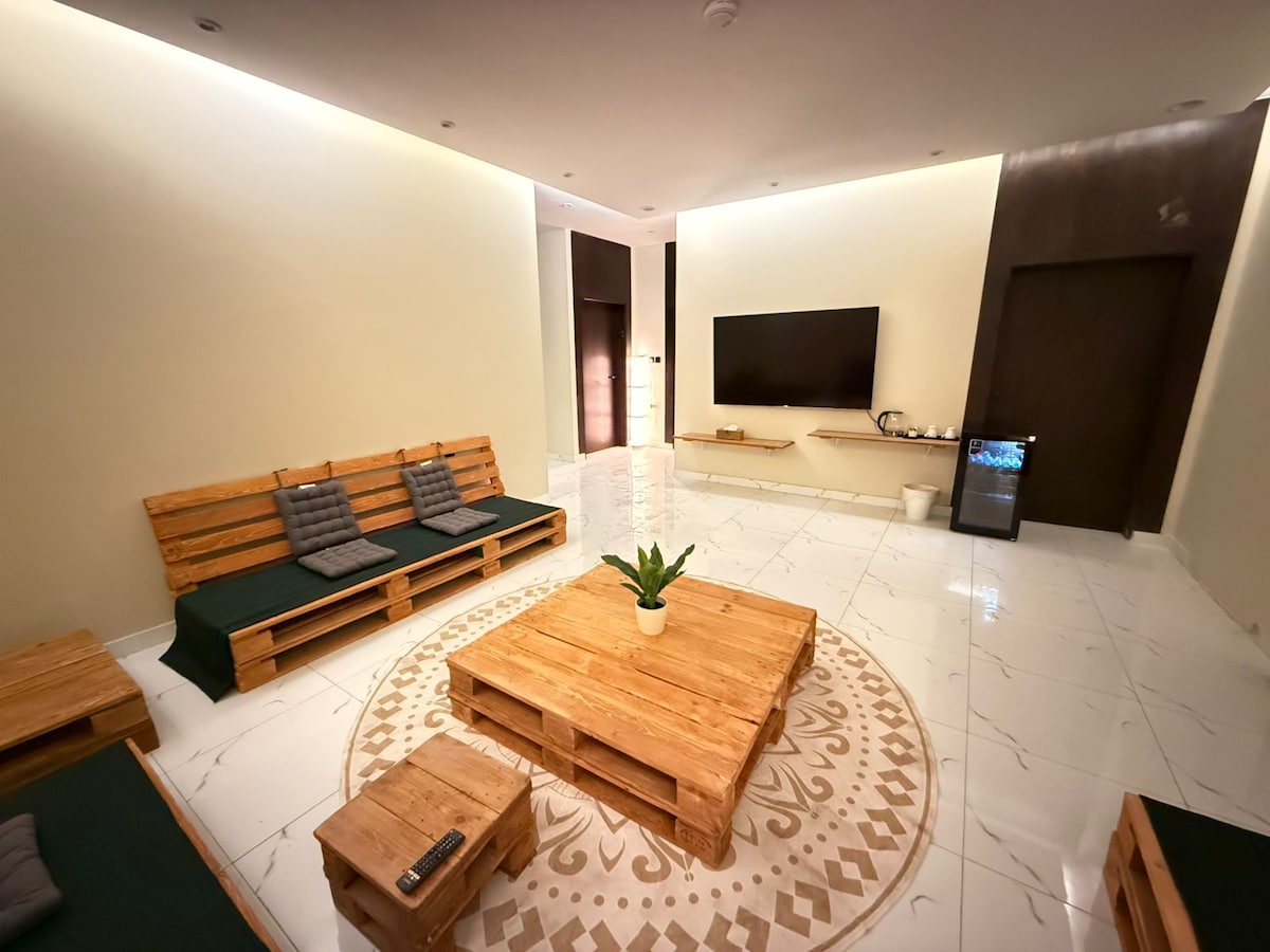 شقة بغرفة نوم وسرير ماستر وصالة واسعة، طراز بوهيمي وإضاءات مختلف القوة لتوفر لك أجواء للعمل والاسترخاء … تتوفر شاشة ذكية كبيرة 70 بوصة مع اشتراك نتفلكس وشاهد مما يوفر لك تجربة ترفيهية فريدة… ركن الكوفي به غلاية وأكواب وشاي مجاني … ثلاجة تحتوي على ماء مجاني … يوجد سخان ومدفأة .. تقع في وسط الطائف بحي القمرية، بالقرب من سيتي ووك الطائف، موڤي سينما، تشيكي تشيز، وحديقة الجال. ستكون ضيافتكم تجربة مميزة لكم وشرف لنا