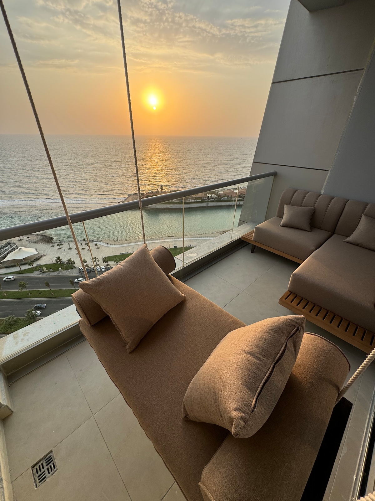 جناح أوشن الأنيق | DAMAC Tower Jeddah 🌇 استمتع بإقامة فاخرة في جناح أوشن الأنيق المطل مباشرة على البحر في برج داماك الفاخر بقلب كورنيش جدة، حيث يجتمع التصميم المودرن الراقي مع الإطلالة الساحرة ، يضم أرجوحة لشخصين وجلسة مطلة على البحر، وجاكوزي لشخصين بمساج للظهر. يتوفر بخيار غرفة نوم واحدة أو غرفتين ماستر مع بلكونة لكل منهما. الجناح مجهز بمطبخ متكامل، شاشات سمارت، غسالة، إنترنت 5G، دخول ذاتي وخدمة تنسيق مناسبات لتجربة فاخرة لا تُنسى ✨ جناح أوشن لتجربة فاخرة تنبض بالهدوء والرقي في جدة 💙🌅