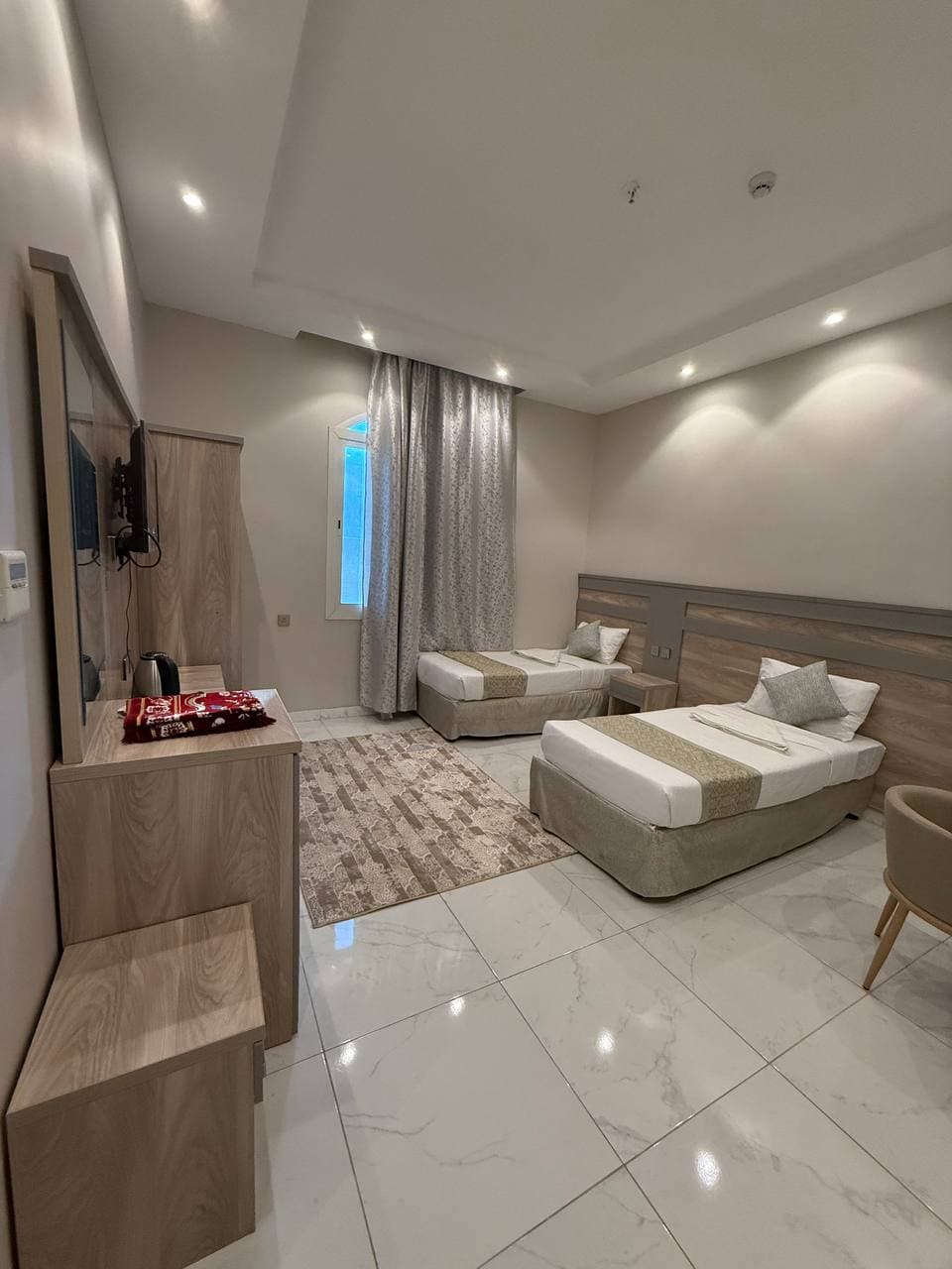يحتوي الجناح على سرير مريح بمرتبة طبية عالية الجودة ومفارش ومخدات فندقية وجلسة لطيفة وطاولة ودورة مياه بالإضافة إلى ركن كوفي فيه آلة قهوة ومشروبات ساخنة وماء ضيافة لضيوفنا الكرام كذلك ثلاجة وميكرويف وآلة لتحضير القهوة العربية وتلفزيون سمارت وخدمة انترنت وطاولة كوي وادوات حمام وغسالة ملابس ، كما أن الاضاءة هادئة ومريحة والغرفة تتمتع بالخصوصية والهدوء الموقع حيوي أمامه ممشى وملعب كره وحديقه فيها ألعاب للاطفال وقريب منه مسجد وباص النقل العام وحوله جميع الخدمات من مطاعم تبعد عن الحرم ٣ كيلو