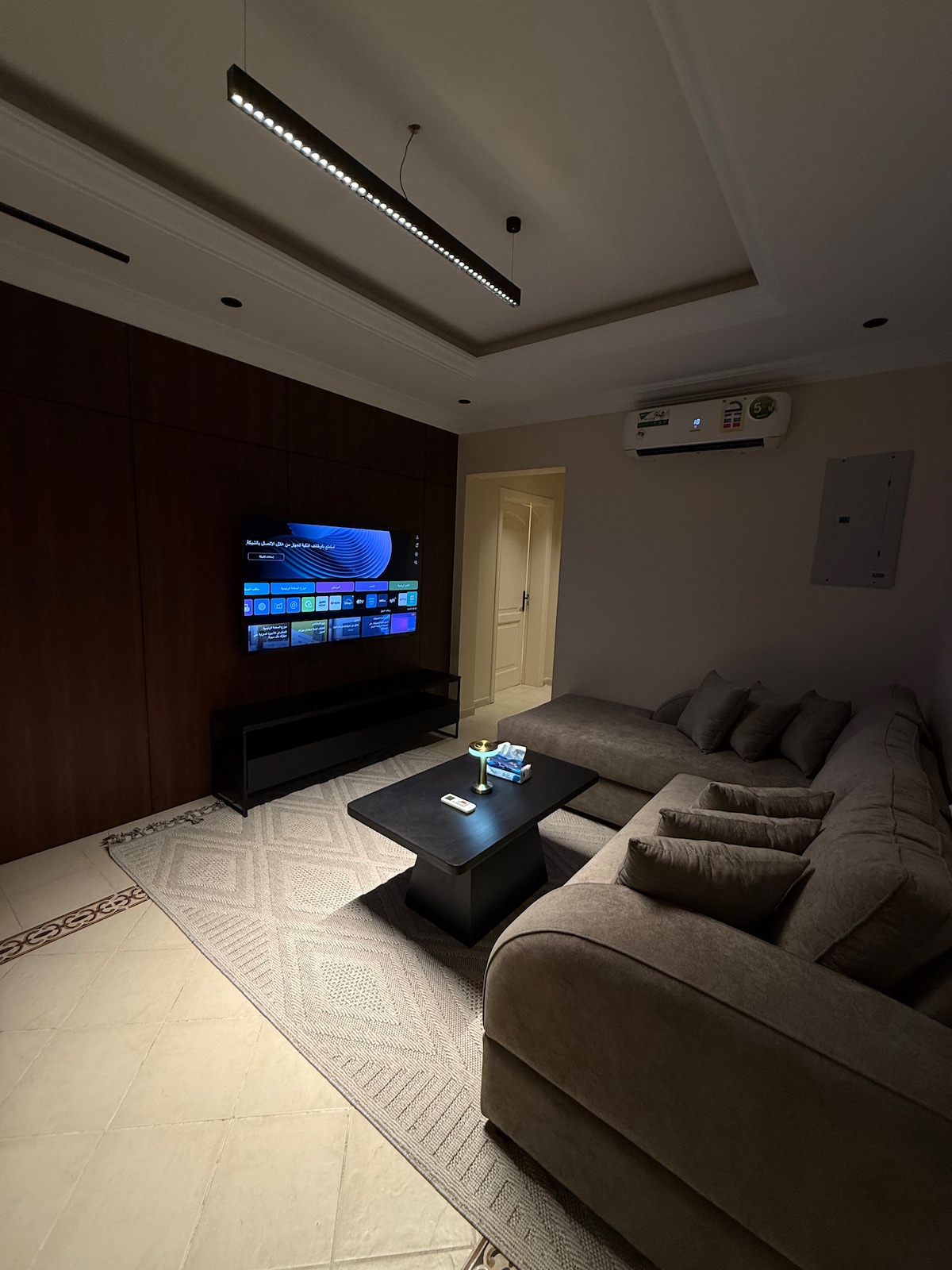 المساحة: تحتوي الشقة على غرفة نوم وصالة وحمامين ومطبخ غرفة نوم رئيسية: مجهزة بسرير مزدوج مع تسريحة ودولاب ملابس الصالة: مريحة وتضم تلفزيون ذكي مع رسيفر بي إن سبورت منطقة الطعام: طاولة طعام تتسع لستة أشخاص، مثالية للوجبات العائلية خدمات إضافية ركن القهوة: مجهز بأدوات V60 وماكينة أمريكانو، مع مجموعة أكواب للقهوة لتجربة مميزة مغسلة خدمة: تقع بجانب الصالة لتسهيل المهام اليومية المطبخ: مجهز بالكامل بجميع الأدوات الضرورية، بما في ذلك صحون، كاسات، ملاعق، ميكرويف، فرن كهربائي، ثلاجة، وموقد كهربائي للطبخ
