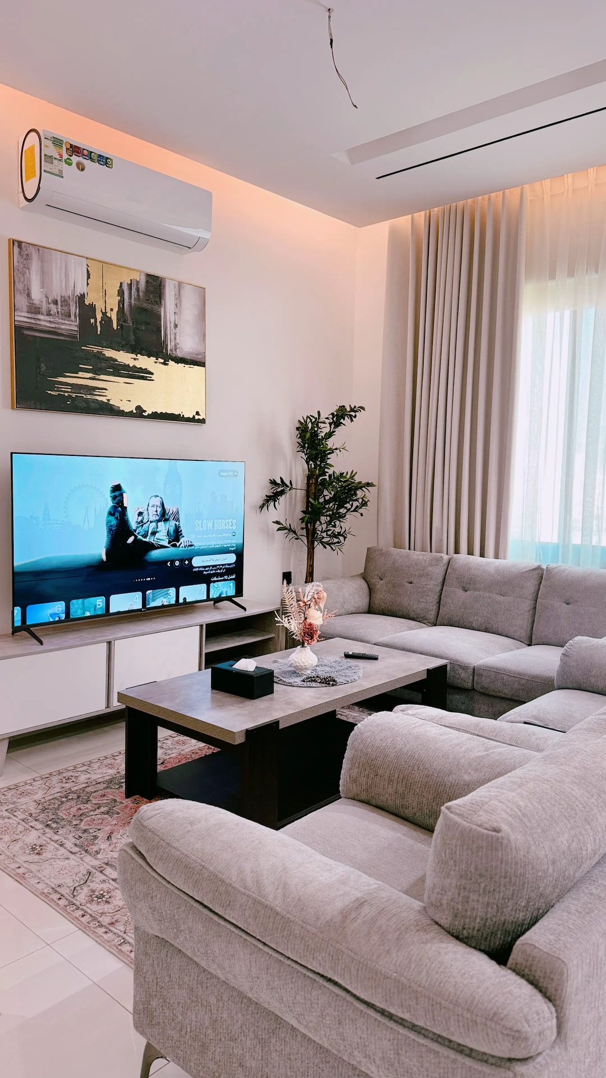 🛋️ تصميم عصري ومريح • تنسيق راقٍ يعكس جو من الهدوء والراحة. • إضاءة ناعمة مثالية للاسترخاء. 🎨 ديكور أنيق بلمسة فنية • لوحات حديثة وسجادات تضيف لمسة جمالية فريدة. • ألوان متناسقة ولمسات عصرية في كل زاوية. 🛏️ غرفة نوم فندقية • سرير مريح بمفارش نظيفة وأجواء تساعد على النوم العميق. 🌙 أجواء مثالية للهدوء • مناسبة للإقامة القصيرة أو الطويلة. • خصوصية وراحة لمحبي السكون والهدوء. 📍 موقع مميز • تبعد الشقة حوالي 15 دقيقة فقط عن طريق الملك. تبعد الشقة حوالي 7 دقائق فقط عن شارع التحلية