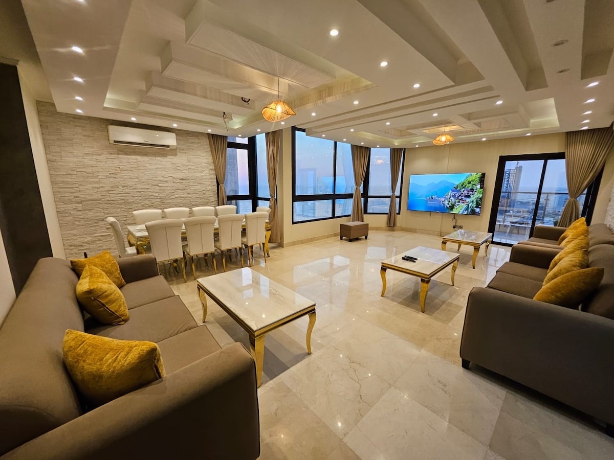 The whole group will be comfortable in this spacious and unique space. It’s near to the best malls, entertainments, corniche & sea walk. The apartment is fully furnished & serviced. The location is 20 mins away from the Airport and less than a 5 minutes walking distance from the beach & shopping malls.