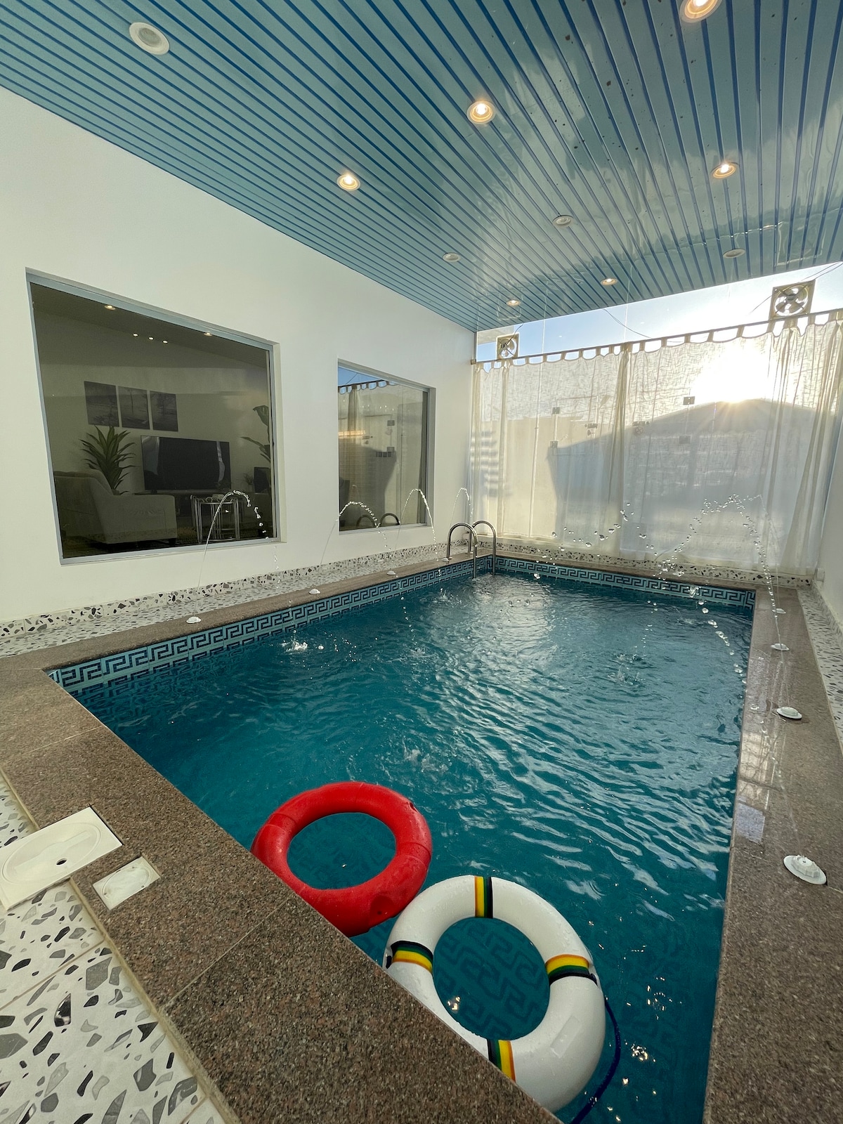 Hoping that you make a good memories with friends and family (All these in outdoor area not in main building) 1 big living room + dinning table 6 seats (service kitchen) only microwave and water heater and small fridge smart TV to watch movies 1 bed room 2 toilets 2 outdoor seats different locations Pool kayak for free You can swim either in pool or sea There is extra insurance 500sar