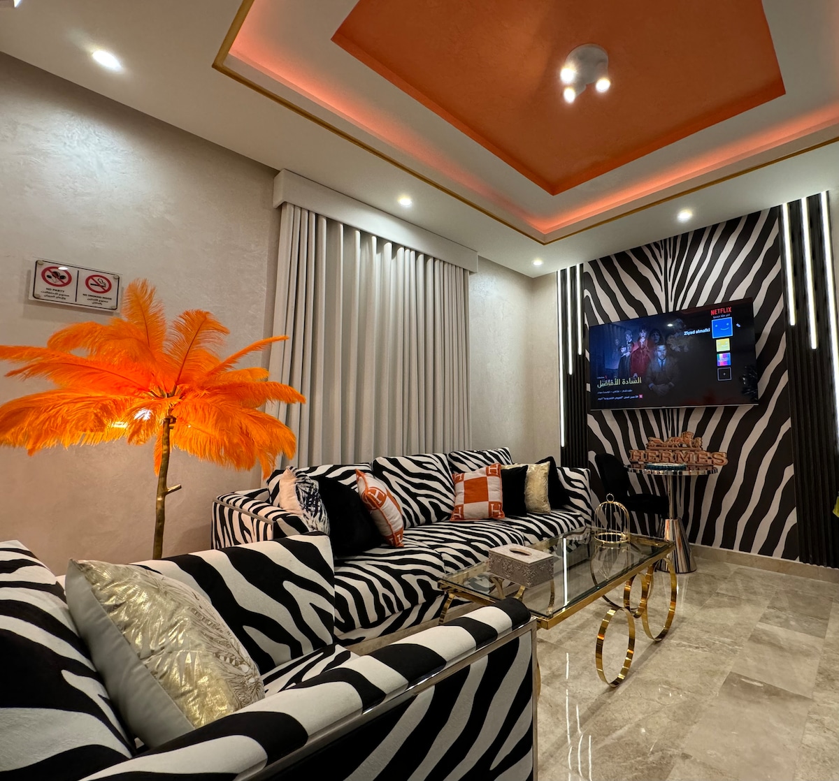 Versace is a luxurious suite with hotel specifications designed to be one of the best suites in the city of Jeddah. The suite not only aims to provide a comfortable experience, but also aims to provide an exceptional experience by all standards. The suite was designed to suit the newlyweds and small families who looking for exceptional accommodation due to the perfect location and luxurious services provided by the suite such as TV cinema, jacuzzi, public swimming pool, sauna, and game room.
