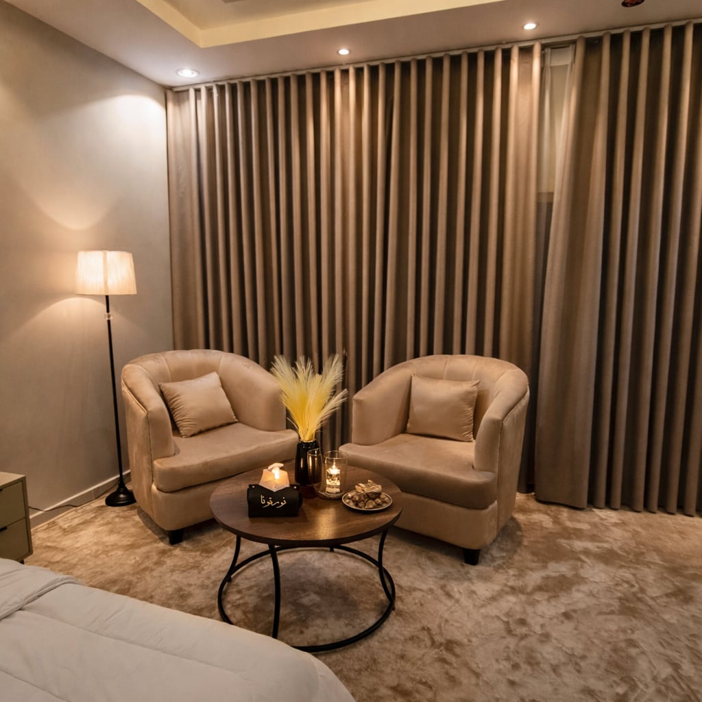 غرفة فاخرة بسرير ماستر مريح، جلسة أنيقة، شاشة ذكية، دورة مياه خاصة وركن قهوة. قريب من الحرم المكي وفي منطقة هادئة وآمنة بجوار جامع الراجحي، مع سهولة الوصول للمولات والمطاعم والممشى. مثالي للراحة والسكينة لقضاء أجمل الأوقات. Luxury room with master bed, stylish seating, smart TV, private bathroom, and coffee corner. Near Al-Haram in a quiet, safe area next to Al-Rajhi Mosque, with access to malls, restaurants, and walking areas. Perfect for comfort, relaxation, and unforgettable stays.