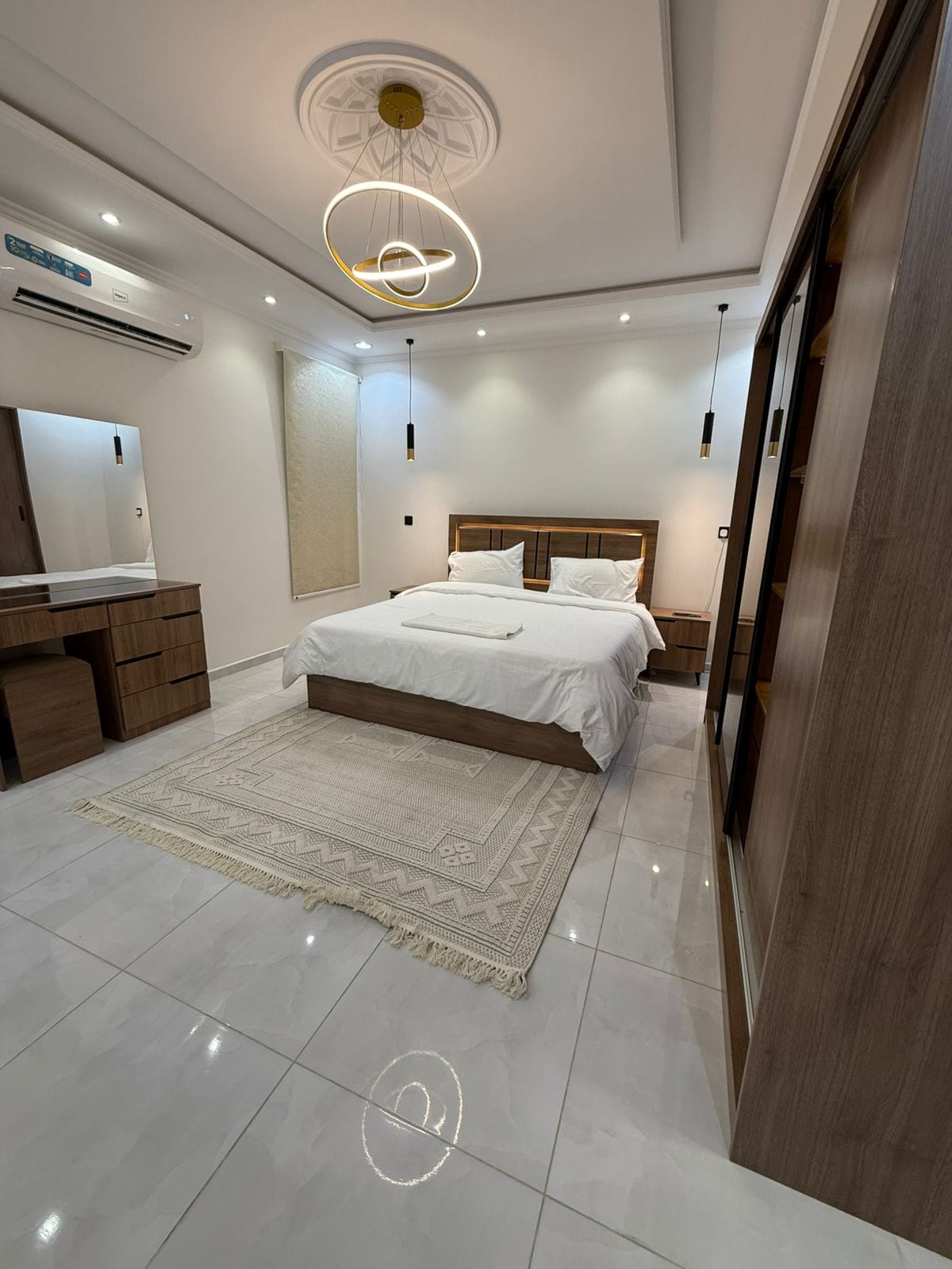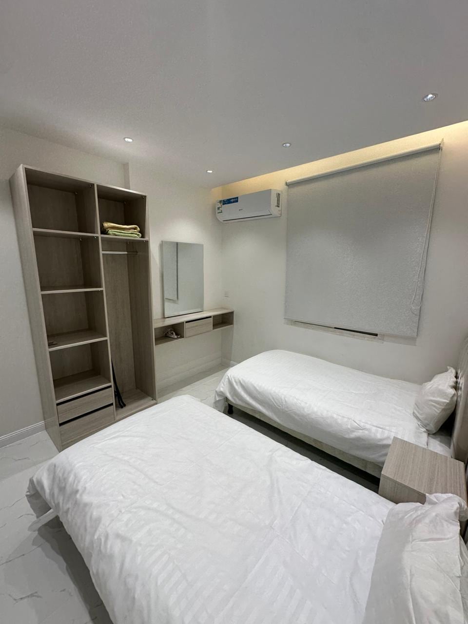 المساحة: تحتوي الشقة على غرفة نوم وصالة وحمامين ومطبخ غرفة نوم رئيسية: مجهزة بسرير مزدوج مع تسريحة ودولاب ملابس الصالة: مريحة وتضم تلفزيون ذكي مع رسيفر بي إن سبورت منطقة الطعام: طاولة طعام تتسع لستة أشخاص، مثالية للوجبات العائلية خدمات إضافية ركن القهوة: مجهز بأدوات V60 وماكينة أمريكانو، مع مجموعة أكواب للقهوة لتجربة مميزة مغسلة خدمة: تقع بجانب الصالة لتسهيل المهام اليومية المطبخ: مجهز بالكامل بجميع الأدوات الضرورية، بما في ذلك صحون، كاسات، ملاعق، ميكرويف، فرن كهربائي، ثلاجة، وموقد كهربائي للطبخ