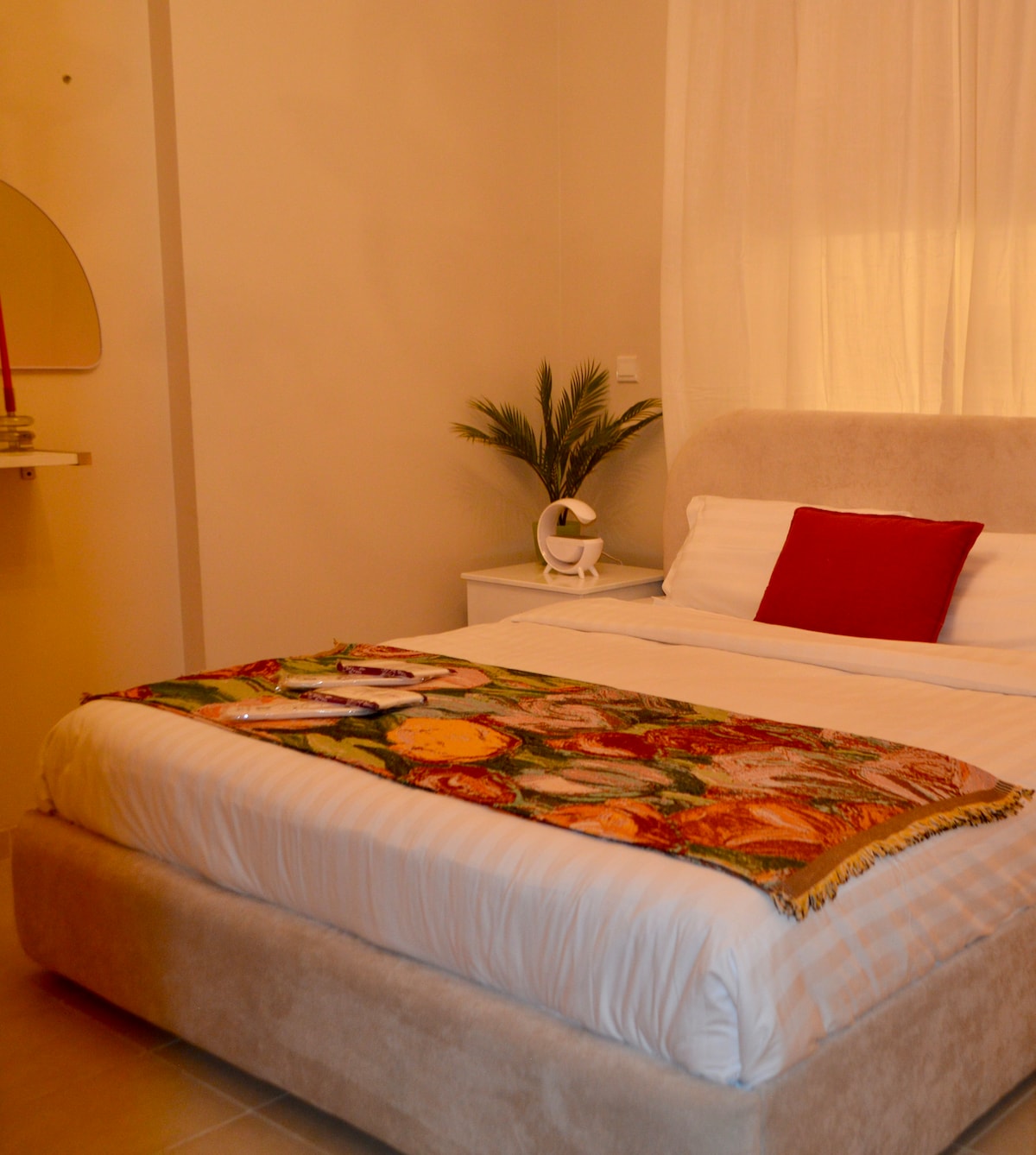 شقة أنيقة وراقية مصممة بعناية لتوفير أقصى درجات الراحة والخصوصية. يتضمن الجناح غرفة نوم هادئة ومريحة، مزودة بسرير ومرتبة فندقيه فاخره. دورة المياه يضم جميع المستلزمات الضرورية مثل غسالة ملابس، منشر، وأدوات الاستحمام بأسلوب متكامل. أما الصالة، فتتميز بجو دافئ ولطيف، توفر جلسة مريحة مع شاشة تلفاز كبيرة وذكية. بالإضافة الى طاولة طعام جميلة المطبخ الصغير والعملي يضم جميع الأدوات اللازمة لإعداد وجباتك بسهولة تتوفر خدمة الانترنت و كل ما يحتاجه الشخص للإقامة المريحة والعملية في مكان ومريح.