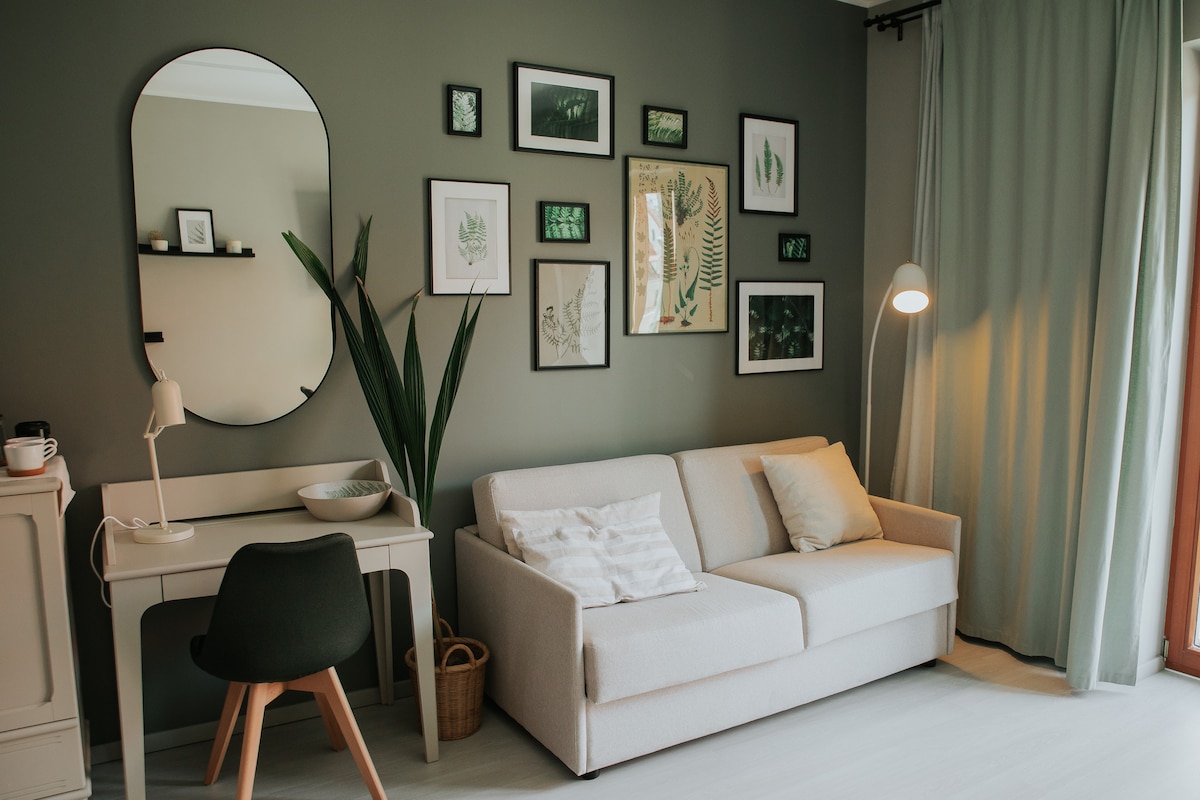 Lovely brand new studio apartment with the private park entrance located right in the city center on Caka street. Designed with elegance and modern detail in mind, this studio flat is warm, sunny and very quiet. Yet behind the doors you will find a busy street with cafes, boutiques and supermarkets. You are right in the center of Riga! The "Old Town" is less than 3km away or few stops of public transport available at your doorstep. Perfect for work or leisure, it can accommodate up to 2 guests.