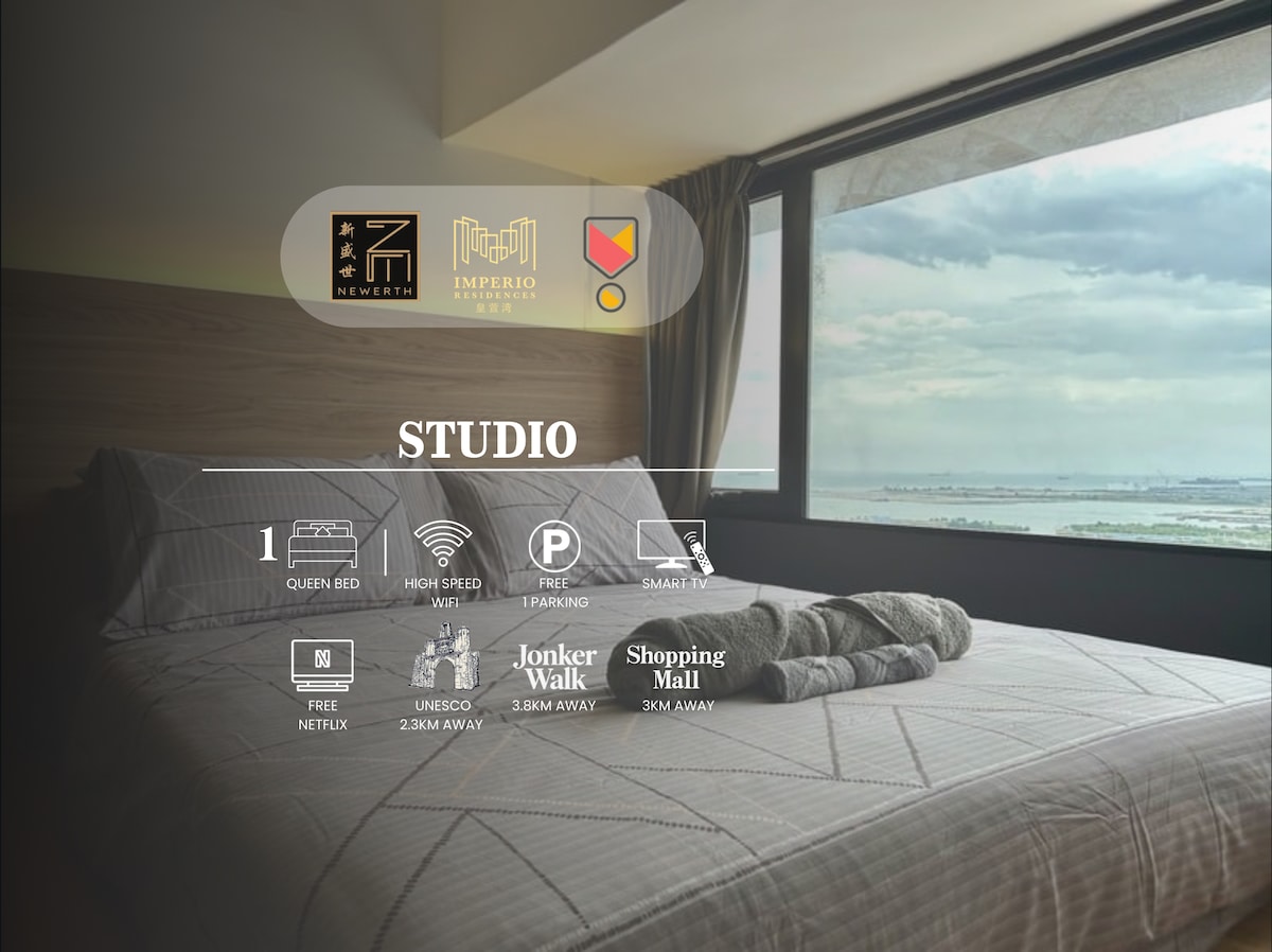 —Studio— Imperio Residence -Cosy Room with bathroom and Bathtub -Adjustable cold/hot water -Queen bed x1 -Pillow x2 -Wardrobe -Make up table with mirror -Air-Conditioned -High Speed Wifi -YouTube & Netflix -Sea View -High Floor *Paid parking HOURLY Upon reservation confirm, we need below information to be provided. The details are needed to submit to condominium management. 1. Full name: 2. IC/Passport Number: 3. Contact number: 4. Vehicle number(If Any): 5. Check-in Time(>3pm):