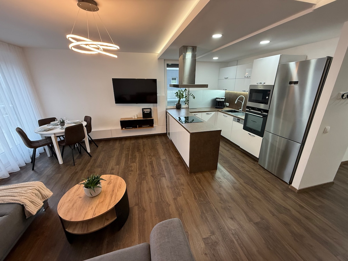 Vyložte si nohy a oddýchnite si v tomto pokojnom, štýlovom priestore. Kompletne zariadený apartmán Vám ponúka všetko čo potrebujete. V plne vybavenej kuchyni si pohodlne pripravíte rannú kávu či obľúbené raňajky, ktoré si vychutnáte na priestrannej terase s krásnym výhľadom. Oddych po práci alebo dlhej ceste si môžete spríjemniť sledovaním Vašich obľúbených seriálov v útulnej obývačke. Samozrejmosťou je súkromné bezplatné parkovanie na vyhradenom mieste priamo pred bytovým domom.