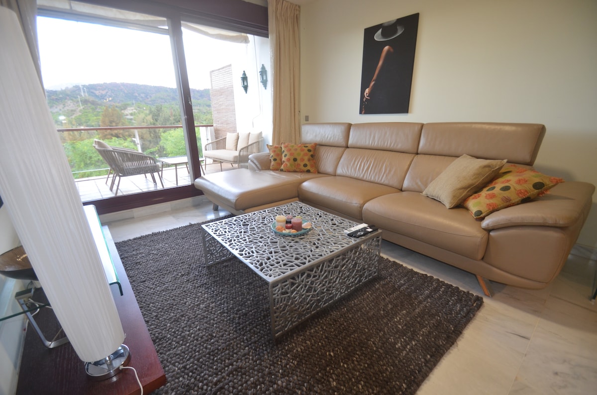 Moderno apartamento situado en una preciosa urbanización, rodeada de villas de lujo, con 2-Piscinas más 1-Jacuzzi Exterior (disponibles solo en temporada). Ofrece confort sofisticado y una excelente localización a solo 10 minutos en coche del Puerto Banús y 15 minutos en coche de Marbella. El apartamento es ideal para 4 Personas disponemos de sofá cama en el salón. Rodeado de los mejores campos de golf de la Costa del Sol, zona ideal para descansar unos días en pareja o familia. A pocos minutos en coche de el Puerto Banús, Marbella, Benahavís y sus fabulosas playa, rodeado a su vez de los mejores campos de golf, de la Costa del Sol (Flamingos Golf Club, El Paraíso Golf, El Higueral Club de Golf, Marbella Club Golf...) podrás disfrutar de días de descanso y relax en nuestro Apartamento, ubicado en la lujosa urbanización Los Palacetes, en El Paraíso alto dispone de dos fabulosas piscinas, un jacuzzi exterior, zonas ajardinadas, solarium, terrazas, wifi gratuito, parking privado (sin coste adicional) y servicio de seguridad 24h. A un minuto en coche supermercados y servicios ( Mercadona, Lidl, Supersol...) El apartamento costa de un dormitorio con cama de 150cm (colchón viscolastica), Cocina completamente equipada, Salón comedor con sofá cama (colchón 135 cm viscolástica), Baño privado con bañera y secador de pelo, Aire acondicionado y calefacción, wifi gratis y Terraza privada. COCINA: Placa vitrocerámica, lavavajillas, microondas, tostador, cafetera eléctrica, hervidor de agua, frigorífico con congelador y menaje de cocina (vasos, cubiertos, platos...) SALON COMEDOR: mesa más cuatro sillas, sofa cama, colchón viscoelastica de 135 cm, mesitas de centro, dos sillones, televisión 49", mantas y sabanas para sofa cama (sin coste adicional) BAÑO: espejo aumento para maquillaje, bañera, toallas, Bidé, secador de pelo... DORMITORIO: sillón relax para lectura, escritorio, cama de 150 viscoelastica, televisor, sabanas, mantas, toallas... (sin coste adicional) TERRAZA PRIVADA: sillones exterior y mesa. LAVADERO: plancha, tabla de planchar, tendedero portátil, pinzas ropa. PARKING PRIVADO Y WIFI GRATIS. La urbanización consta de dos fabulosas piscinas y un jacuzzi exterior, servicio de hamacas gratis, preciosas y tranquilas zonas ajardinadas, tu lugar perfecto para descansar y relajarte en unas inolvidables vacaciones en la Costa del Sol. Estaremos disponibles durante la estancia, para cualquier duda o consulta. El apartamento se encuentra situado en la urbanización Los Palacetes, rodeado de villas de lujo, y los mejores campos de golf de la Costa del Sol, rodeado de naturaleza y a tan solo escasos minutos en coche de las maravillosas playas de Puerto Banús y Marbella. Ideal si traes tu coche de alquiler, disponemos de plaza de aparcamiento privada para tu coche, totalmente gratis! Dispones de todo cerca del apartamento, supermercados a 1 minutos en coche, restaurantes 5 minutos en coche, Puerto Banús 10 minutos en coche... Si por el contrario vienes sin coche, la parada de bus más cercana a 35 minutos andado... también disponemos de servicio de taxis que te recogen directamente en el apartamento y te llevan a donde necesites, precio del apartamento a Puerto Banús 12,00€ aproximadamente, cualquier duda no dudes en consultarnos! :) Zona muy tranquila, disfrutar para descansar unos días de relax en pareja y familia, rodeado de los mejores campos de golf de la Costa del Sol, a pocos minutos en coche de las mejores playas de Puerto Banús, Marbella y Estepona. Grandes piscinas y el mejor clima que puedes imaginar! Ven y disfruta! :)