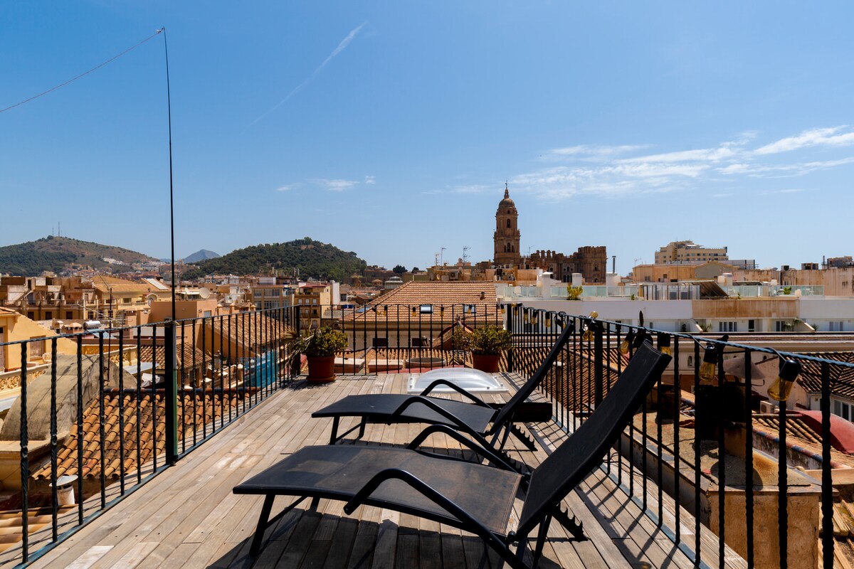 Recien Reformado! INCREIBLES VISTAS !A estrenar ATICO de LUJO! 3 TERRAZAS con 360º sobre el Casco antiguo de Malaga. a A un paso de la plaza de la Constitucion , Calle Larios y la Catedral. Calle Especerias donde esta ubicado el alojamiento es una de las mejores calles de Malaga centro. Podras tomar el sol en las tumbonas o disfrutar de una copa de vino al atardecer. Es un edificio residencial de alto standing con dos dormitorios ( uno en suite) y dos baños. VISTAS INCREÍBLES! Playa a 10' min.