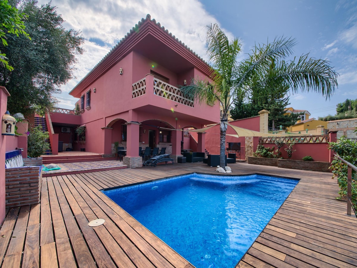 Buscas buena ubicación pero a la vez quieres poder disfrutar del sol 365 días al año ? Esta villa soleada además de todas las comodidades ofrece diferentes espacios al aire libre, PISCINA PRIVADA CLIMATIZADA ,GIMNASIO, PARKING GRATUITO y CINE. Excelente barrio con buenas conexiones de bus y metro. Su ubicación privilegiada te sitúa a 10 minutos de cualquier punto de Málaga. Casa con una decoración cuidada que combina decoración moderna con toques andaluces y malagueños…PROHIBIDO FUMAR/FIESTAS