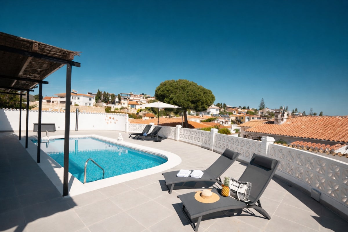 Stunning family-friendly villa with heated pool, sleeps up to 12, just 20 minutes from Málaga Airport and the beach, and 5 minutes from the beautiful town of Alhaurín de la Torre. The main house offers 4 bedrooms and 3 bathrooms, plus an annex apartment with 2 extra bedrooms and a bathroom – perfect for large families or groups. Enjoy a private garden, BBQ area, trampoline, chill-out bed, and fast Wi‑Fi, all in fully air‑conditioned comfort for an ideal Costa del Sol getaway.
