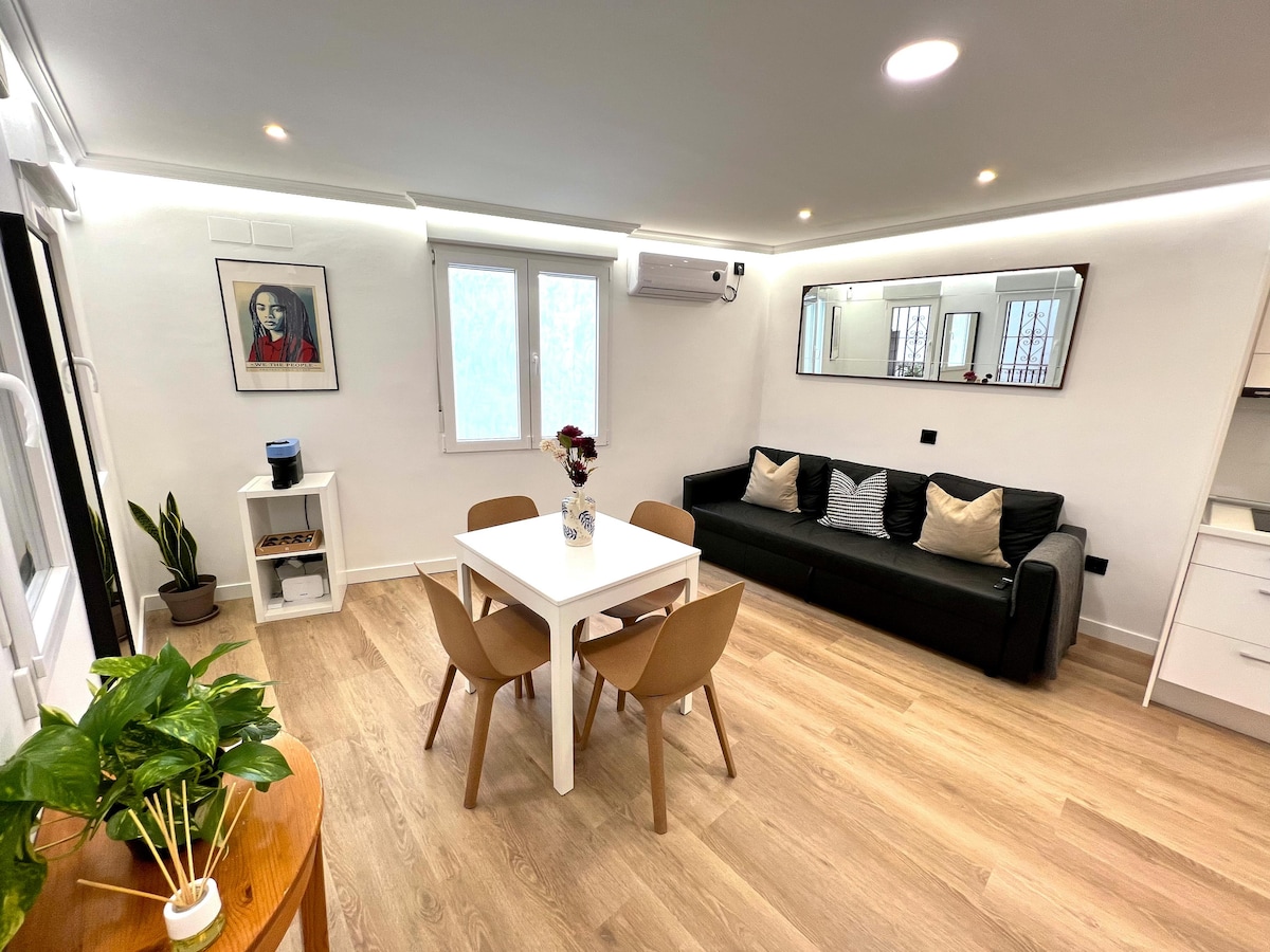“Vine” apartment is located in Madrid center, off Gran Via, on a quiet street in a new building with elevator. It is nature-inspired, bright & modern, has WiFi, is fully equipped and is very close to restaurants, tapas, the Metro, shops & galleries. Best for a single, couples or couples with a kid! Pets are invited happily!!! The apartment is located in a new buliding, with an elevator! It is modern designed, with lots of greenery, themed to its name, Vine. A huge window along the length of the whole apartment overlooks a beautiful private garden. The apartment consists of a bedroom with a double bed, a living area with a single pull-out sofa, kitchen and bathroom. It has WiFi and is fully equipped, including a washing machine, TV, air conditioning, and Nespresso coffee maker - all just ready for your comfort and enjoyment! The apartment is a studio open space apartment - and it's all yours to enjoy! There are no areas in the apartment that you cannot use or access! We love hosting, but also respect our guests' privacy! We are here for you as much as you would like! Located just off Gran Via in lively buzzing Malasana neighborhood with its great range of authentic cafes, tapas & bars. Huge Zara Primark & Mango are minutes away. Best Madrid sites like Royal Palace, Puerta del Sol & Museums are in walking distance The Central Metro Station Gran Via is a 2 minute walk from the apartment. From there you can take the metro to anywhere you want in Madrid and also to all the train stations that will take you out of Madrid to the rest of Spain. If you come by car, a big parking lot is located at Barco 1, Madrid, just a minute from the apartment. There is also a bicycle-rental station close by. A hosting kit of water, soda, milk, coffee, tea and sweetners will be waiting to welcome you :-)