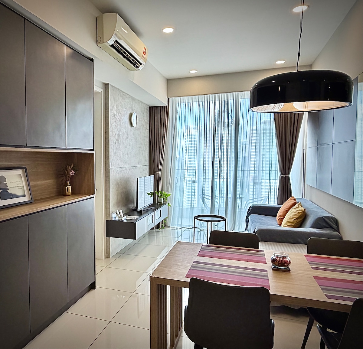 This 1 Br apartment comes with a breathtaking view of KL skyline. It has a 3-seaters sofa living room, dining table, kitchen, desk and a big balcony facing the KL Tower & Petronas Twin Towers. It comes with a 55” TV, Hi-Speed WIFI and a Queen size bed that can fit you comfortably. *The other unit of this Dual Key apartment is a compact Studio with Queen size bed, pantry, washroom & bath. It can fit in friends who travel with you with privacy. Welcome to ask for more details!