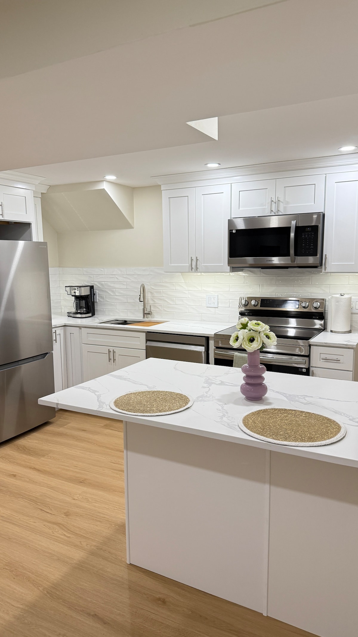 Located minutes from Tufts/Somerville, Cambridge, and Boston. This recently renovated flat offers a spacious, chic, open concept design with hardwood floors, lots of natural light, blackout shades, and glass markerboards. Modern kitchen equipped with stainless steel appliances and coffee machine. Stylish living room features a 65" flat screen smart TV, floating shelves, and adorable couch. Comfy bedroom offers a memory foam mattress, powered stand-up/sit-down Uplift Desk, and foldable treadmill.
