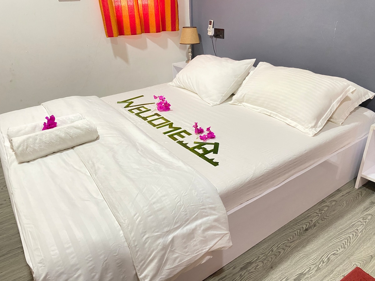 This apartment is located Just 15-20 minutes car drive from Male International Airport Enjoy your stay with your family at this peaceful place with the awesome view of the ocean, gentle Breeze and the waves sound of the ocean. You will get to see the Sunrise and Moonrise from the room, sitting room FAMILY ROOM restaurant is situated at the house ground floor. Restaurants cafeterias groceryshops and watersport areas are just 4 to 5 minutes walk from the house.