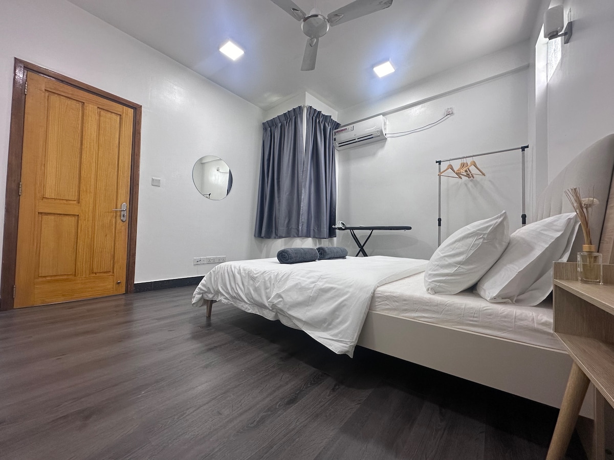 Near Male’ main road. 5 minutes walk to beach. - Holiday ✅ - Business ✅ - Transit ✅ - Long stay ✅ - Families ✅ - Couples ✅ BEDROOM - Queen sized 🛏️ - Comfortable pillows - Cozy quilt - Extra sheets - Security safe - Scented aroma - Air condition - Ironing BATHROOM - Hot water - Toiletries - Towels - Toilet paper - Bidet LIVING ROOM - Sofa + blanket - 📺 - WiFi - ⛑️ box KITCHEN - 🍽️ & glasses - Pots & pans - Cooking utensil - Gas Stove - Salt &🧂 - Oil - Coffee - Sugar