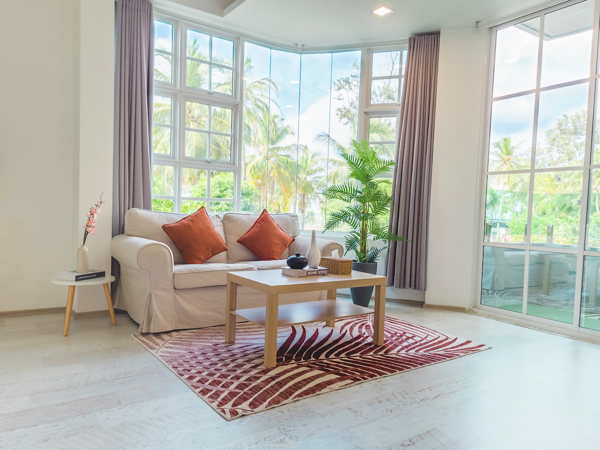 Apartment is located in a peaceful area, close to the beach and a shopping mall. It has big balcony and windows bring in plenty of sunlight, creating a cozy atmosphere. It's an ideal place to spend time with friends or unwind by yourself. It's more than just a home—it offers a tranquil atmospheres in this spacious and serene space.