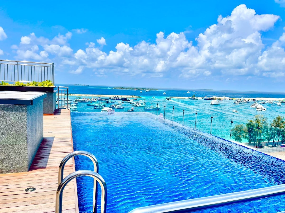 Our charming beachfront studio apartment suite in Hulhumale (10 min drive from airport)! This spacious and beautifully designed suite is perched on the terrace and has a mesmerising sunrise beach view. with a small kitchenette. Nearby variety of dining options & shops. any help? I'm just a text away. Airport pickup and drop off per way + $10 Price is all inclusive without any hidden charges. - Continental Breakfast $7/ person - Free WIFI & Cable TV with Netflix - Free cleaning once a day