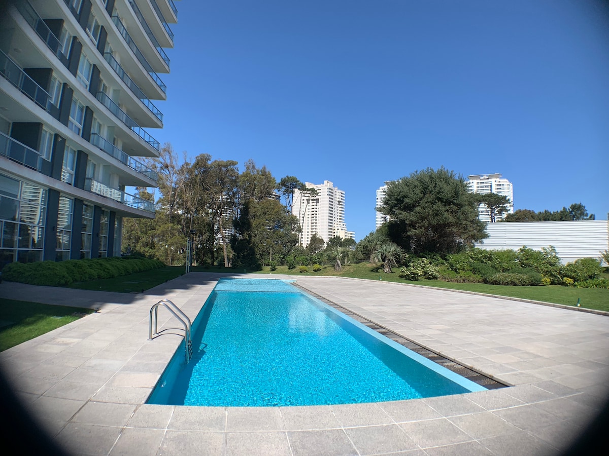 Hermoso apartamento nuevo en espectacular zona, sobre playa Mansa. Sombrilla y reposeras a tu disposición como huésped. Excelente condominio con piscinas climatizadas, play room, gym, solarium, barbacoa, laundry, cochera para 2 autos. Amplios espacios abiertos enjardinados y parquizados. Lugar tranquilo para descansar y relajarse. A 10 minutos de la península. Apto. un dormitorio, Aire Acondicionado, baño columna hidro, living comedor, cocina integrada, isla, amplia terraza. Bienvenidos.