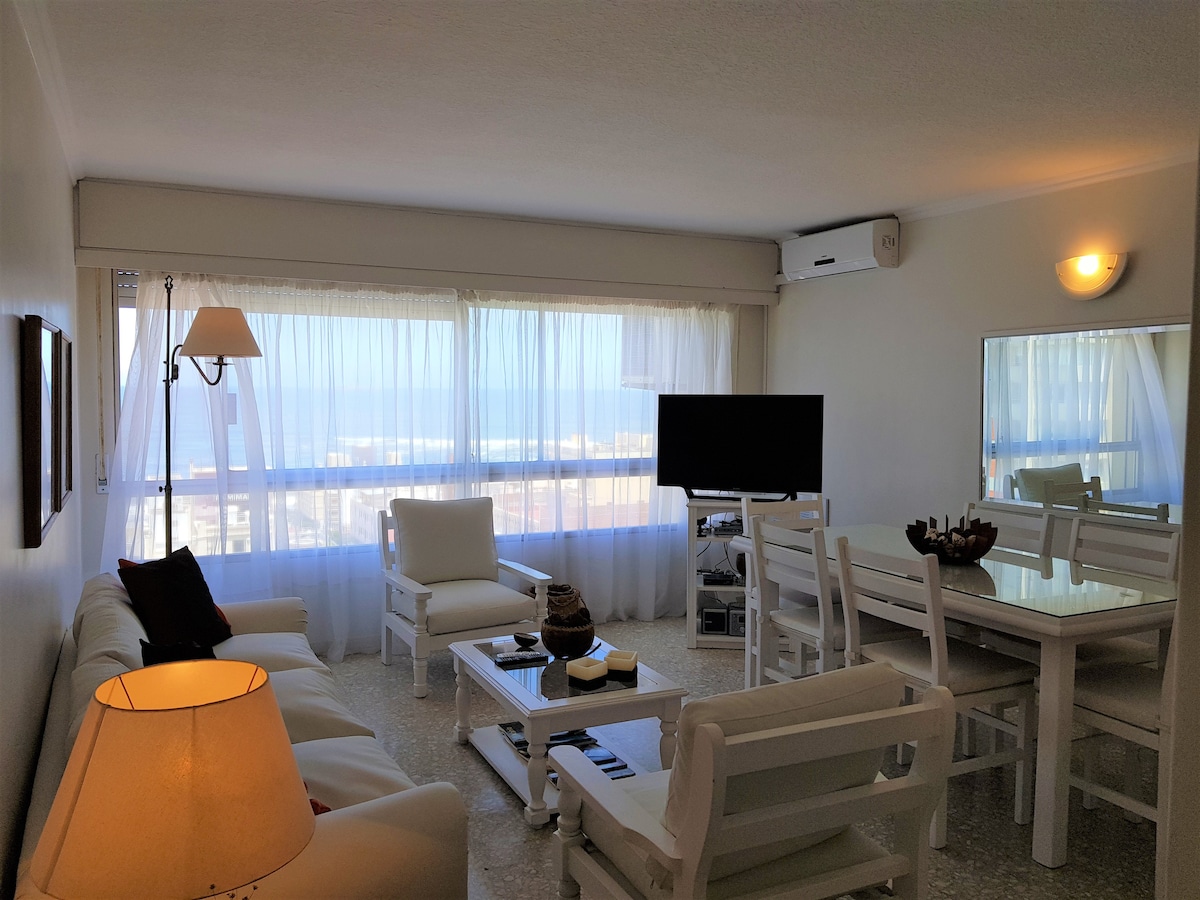 Piso 18, 3 habitaciones (6 personas) , 2 en suite, 4 baños, una cochera cubierta (menos 1,855 metros de ancho), tv x cable, internet, ropa blanca (se cambia 1 vez x semana) , aire frio/calor en todos los ambientes, servicio de mucamas y vista al mar desde todos los ambientes!