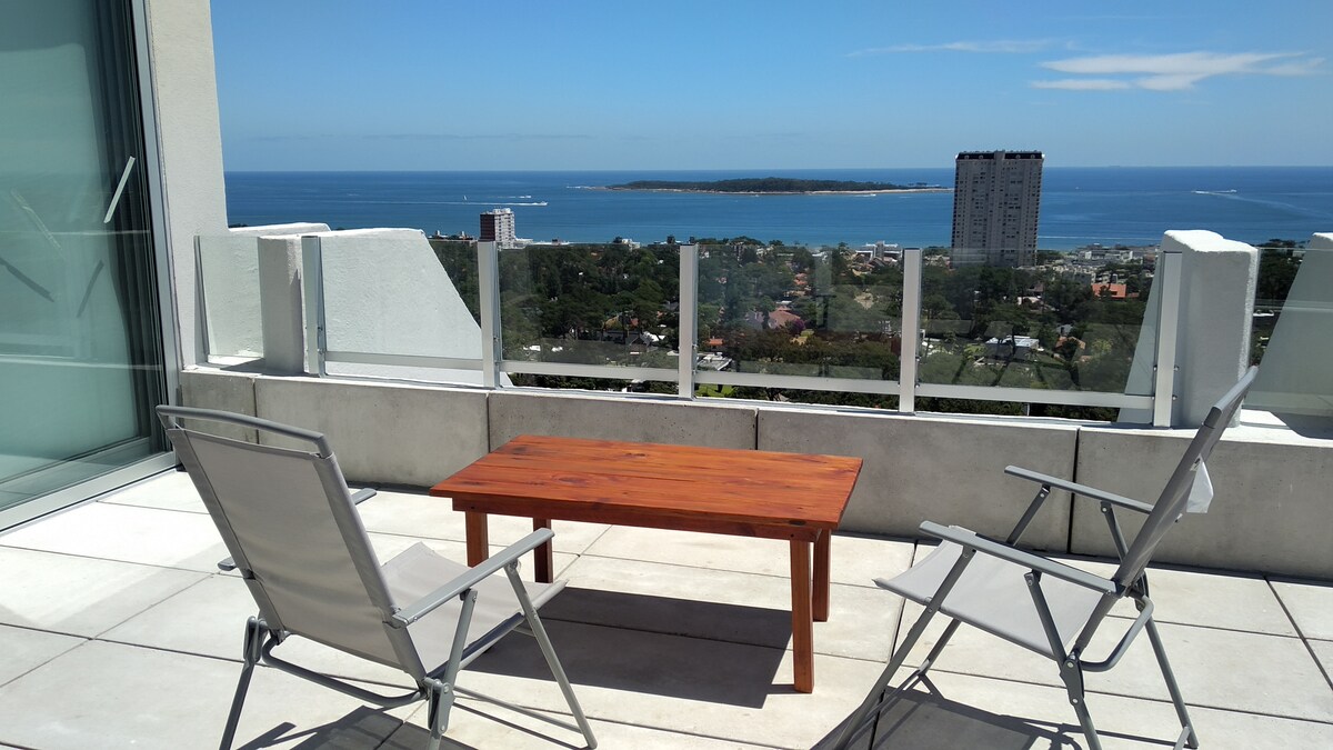 Disfruta de tu estadía en Punta del Este en un apartamento a estrenar, piso 18, con espectaculares vistas y muchísima luz natural en todos los ambientes. Edificio muy bien ubicado, con excelentes servicios: piscina climatizada, piscina abierta, gimnasio, barbacoa, cancha de futbol de césped sintético, microcine, sala de niños, adolescentes y adultos, garaje cerrado propio, recepción 24 horas, lavadero, etc El huésped puede elegir una cama king size o 2 sommiers separados