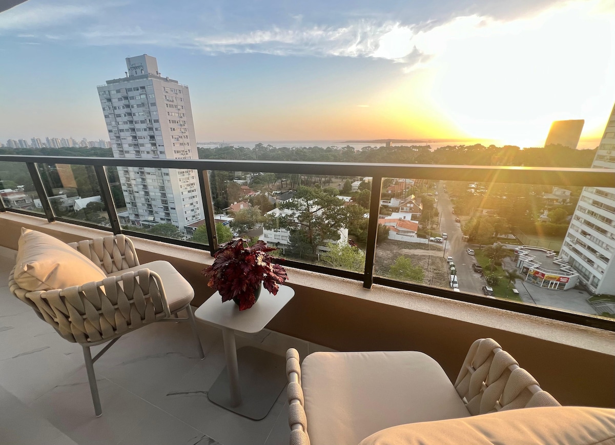 Moderno apartamento para 2 personas totalmente equipado con espectacular vista al mar y la península con 2 balcones, situado a cuadras del centro y de las playas mansa & brava. Incluye el uso de cochera propia, amenities de alta categoría como piscina interna y externa, sauna, gimnasio, business lounge y recepción atendida 24h. Ideal para relajarse y disfrutar de Punta del Este durante todo el año o combinar descanso y trabajo ya que dispone de una conexión rápida de internet (200 Mbps).
