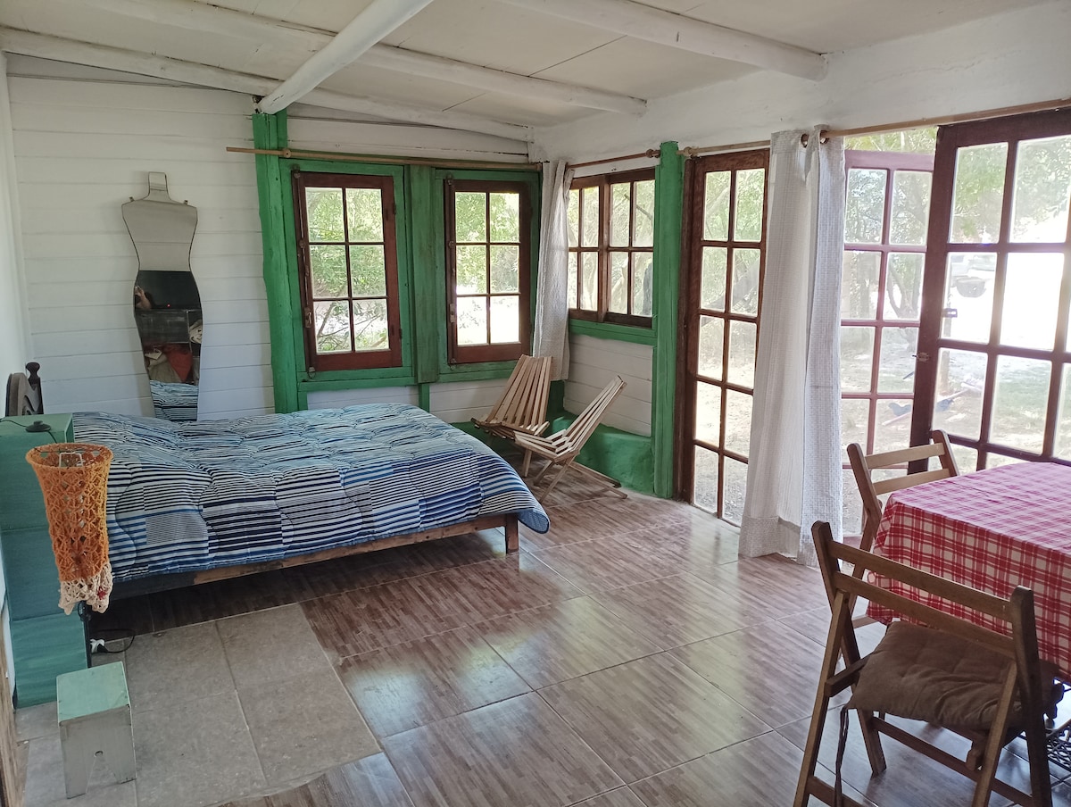 Zona arbolada, con buena sombra, predio cercado. A 8 cuadras de la playa. Lugar tranquilo, comercio de suministros varios a una cuadra y media. Turbo ventilador, microondas, tostadora, mixer, cocina a gas, heladera. Construcción de material. Espacio para guardar vehículo dentro del predio.